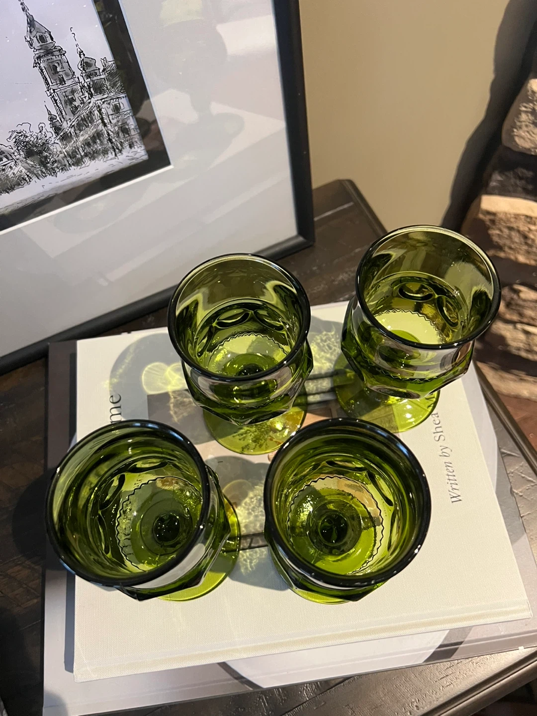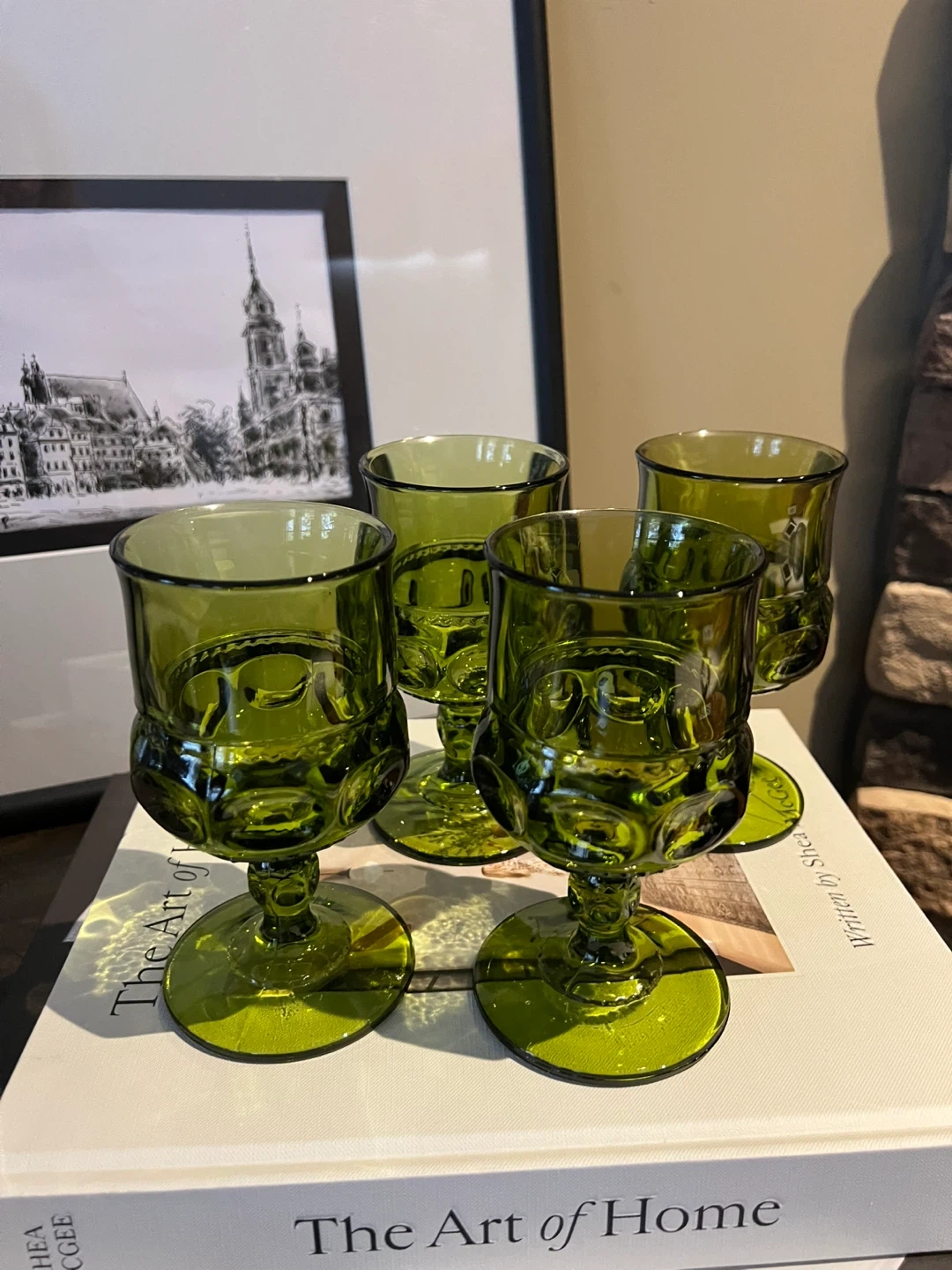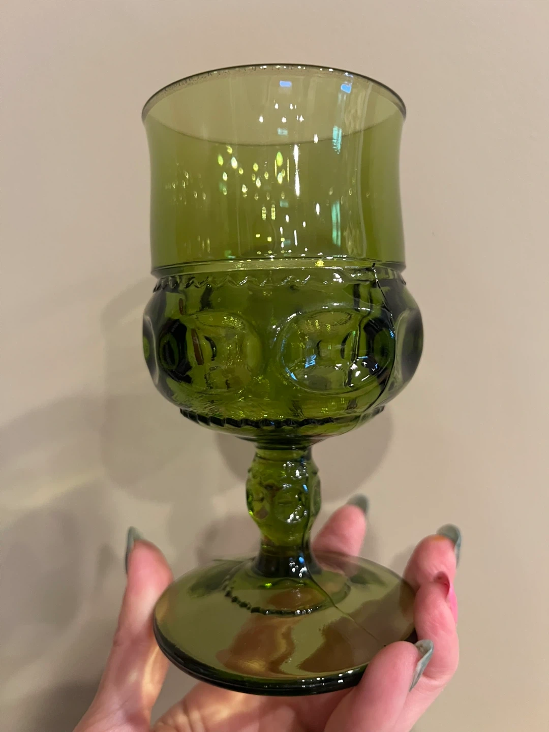 Indiana Glass King's Crown thumbprint goblet in avocado green, a classic mid-century design
