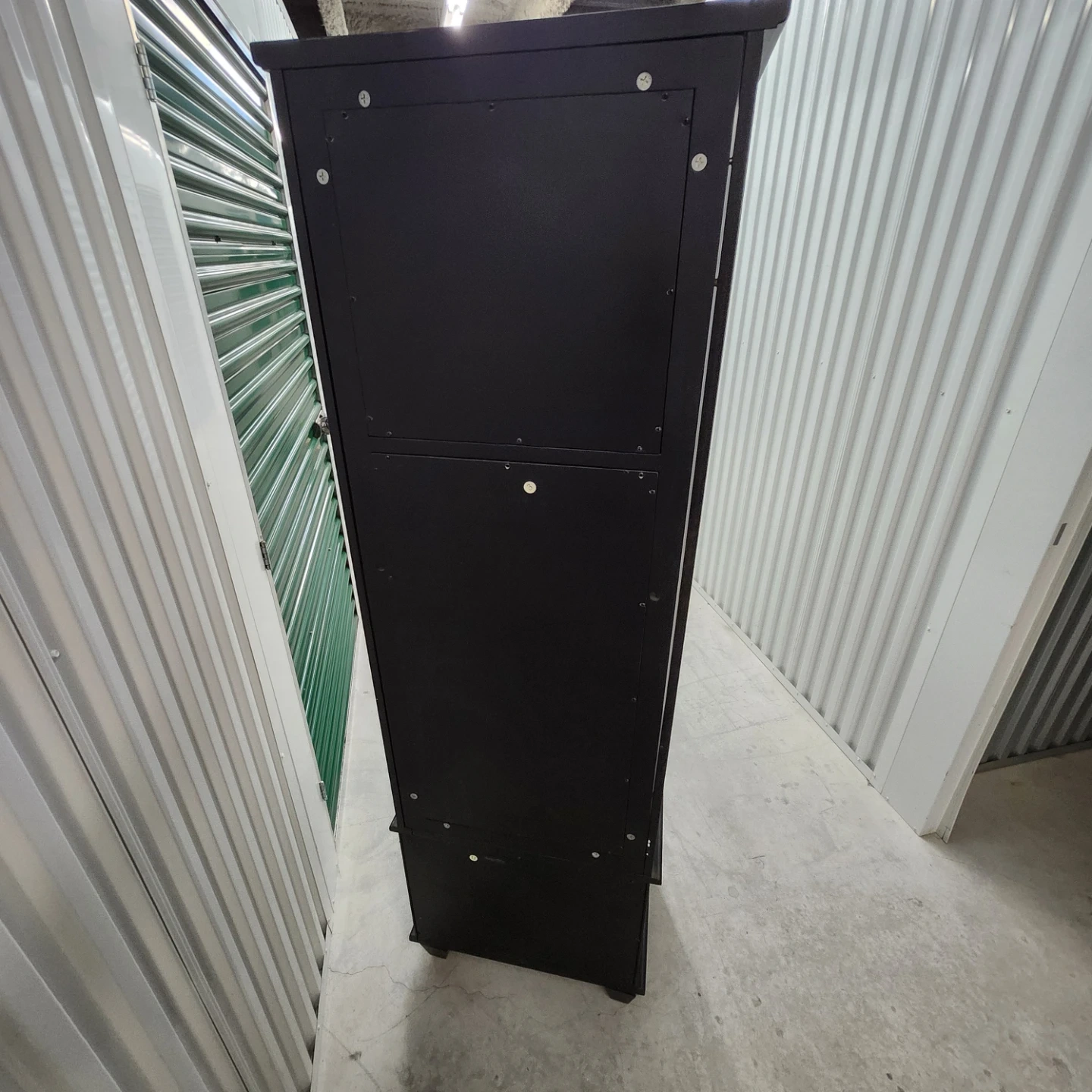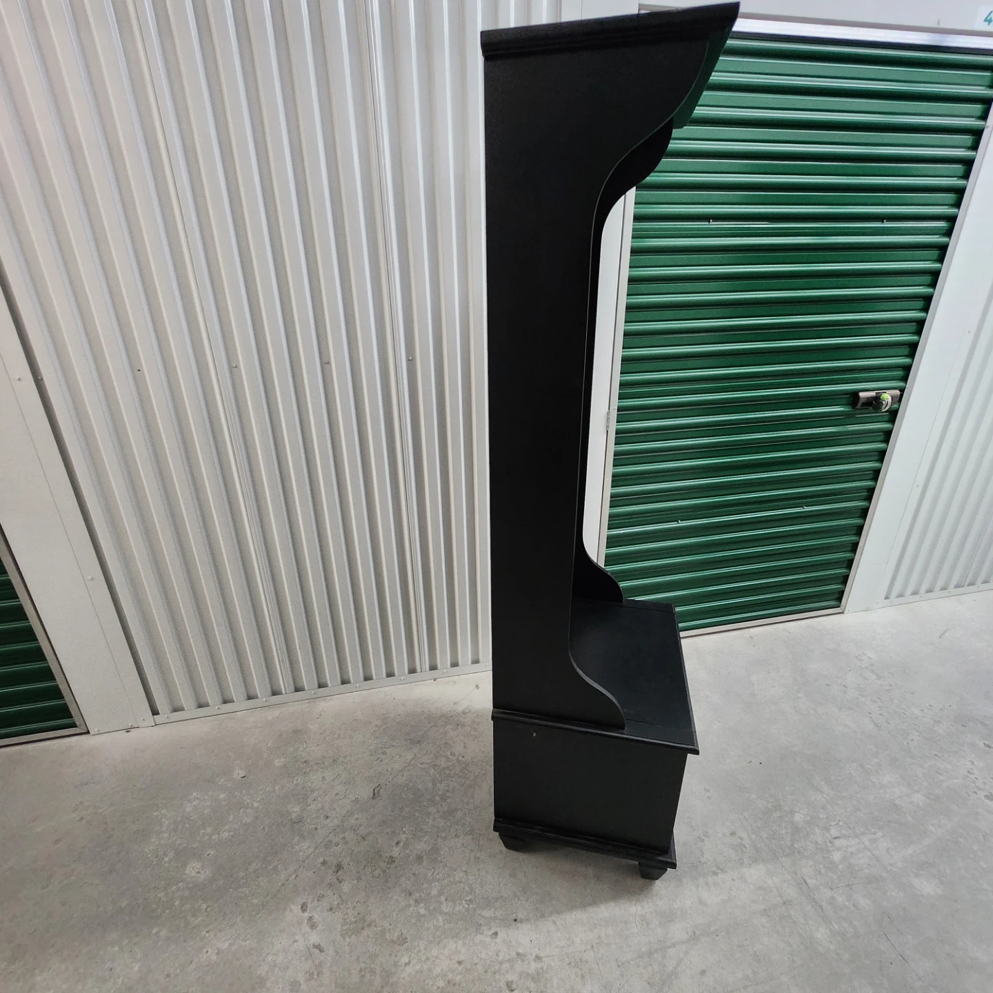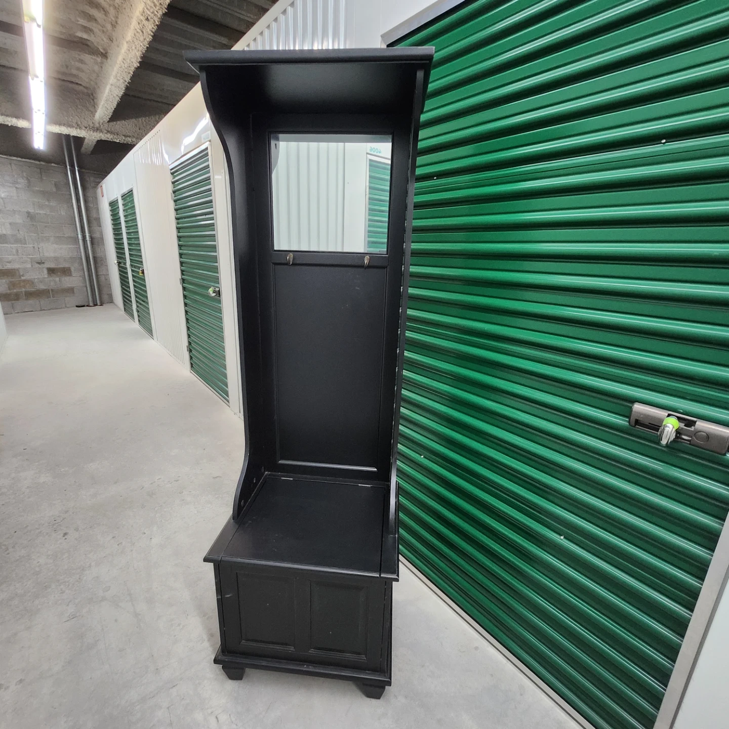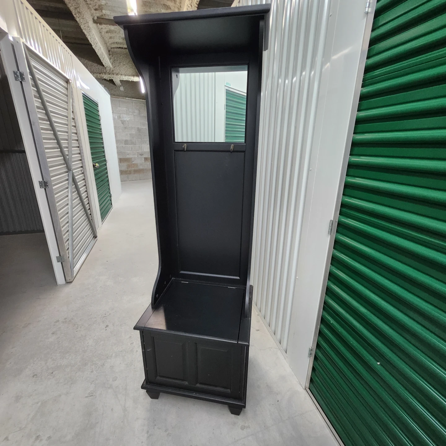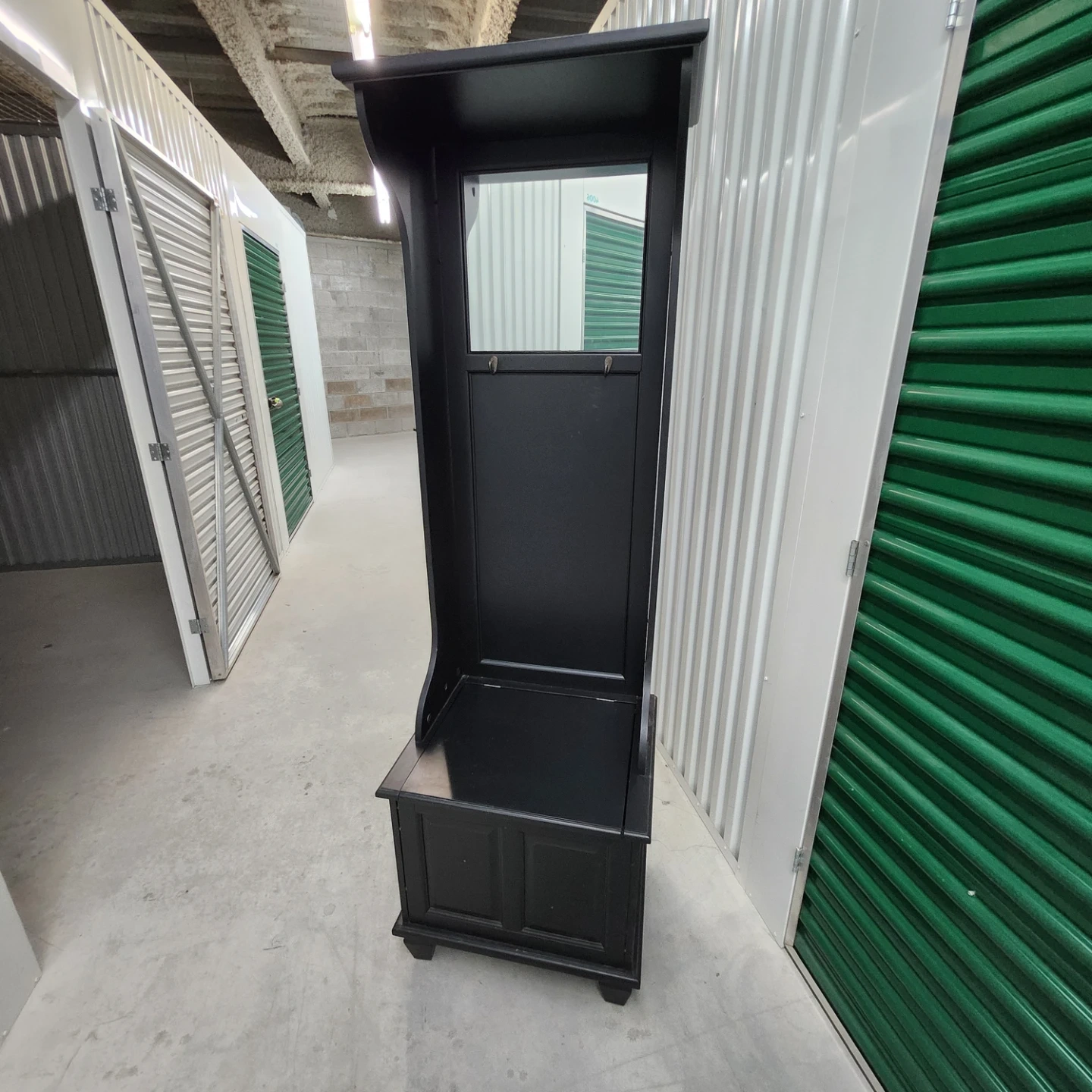 This black hall tree bench offers convenient storage and a place to prepare before heading out. It includes a mirrored top section with coat hooks and a bench seat with a storage compartment underneath. The dark wood finish complements various decor styles.