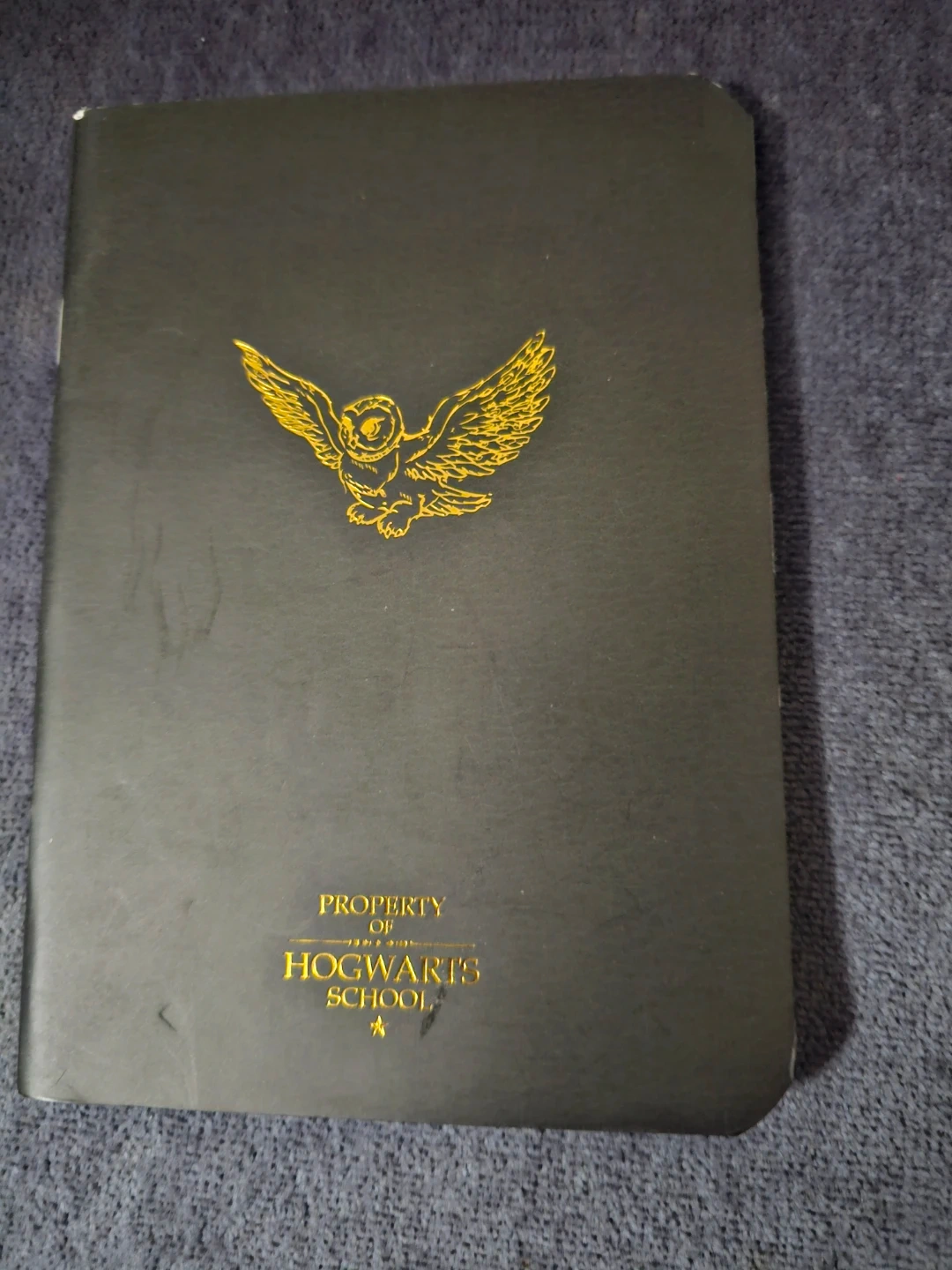 This is a Harry Potter themed notebook. It's black with a gold owl design and "Property of Hogwarts School" printed on the front. The inside pages have lines and a Hogwarts castle silhouette. Perfect for any Harry Potter fan to jot down notes!