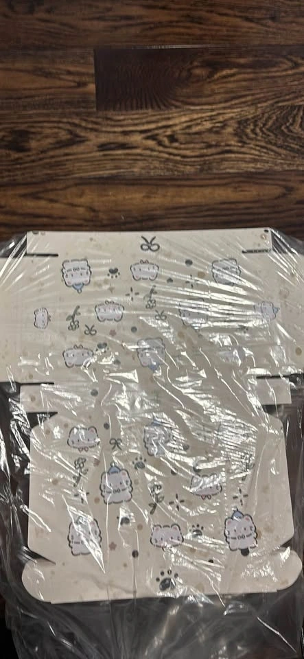 Cute unassembled cardboard boxes with two super cute designs. One is beige with cats in blue hats, bows, and paw prints. The other is light pink with cats holding hearts, bows, and strawberries. Still in plastic wrap, never used. Great for gifts or little packages!
