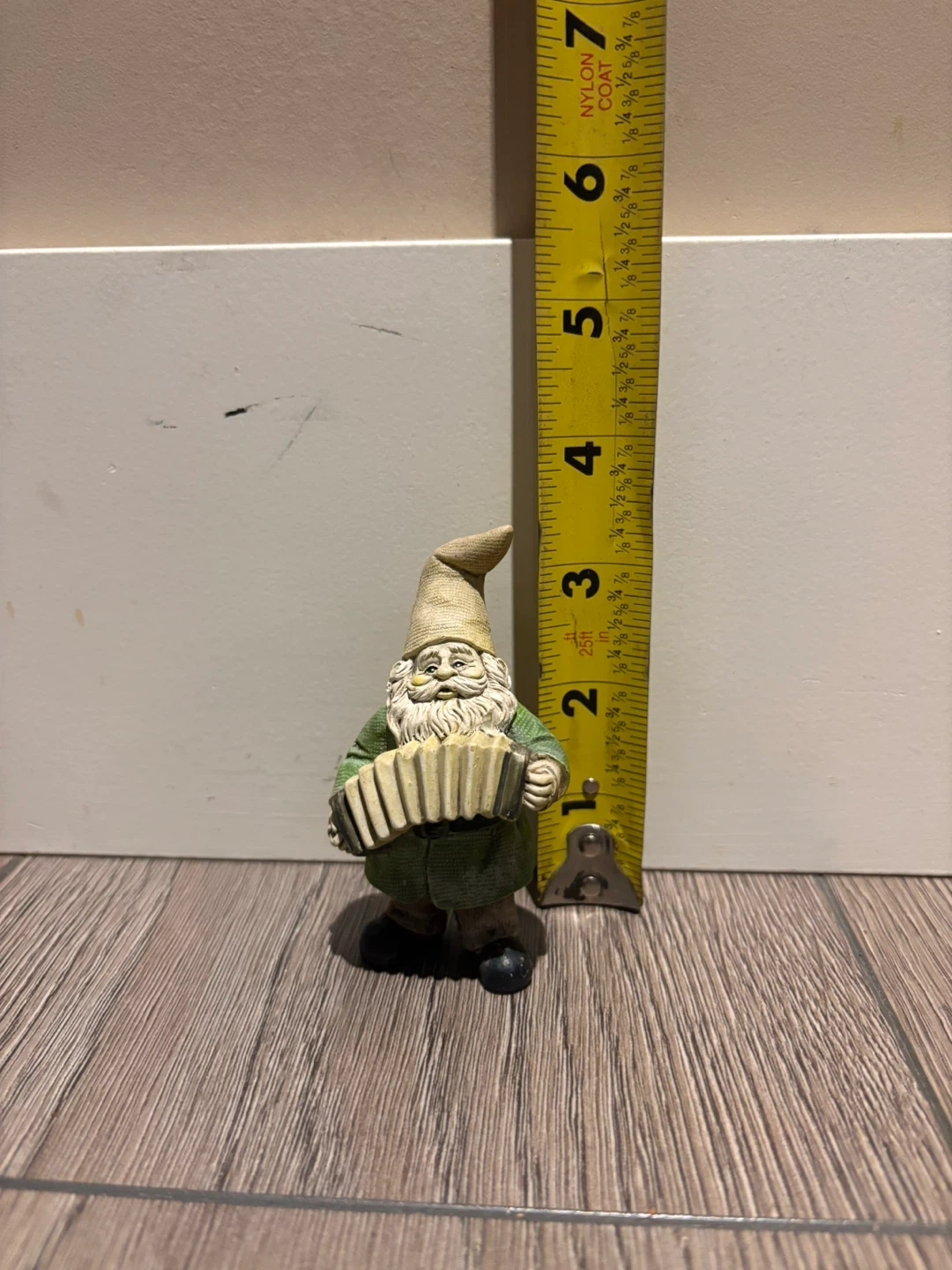 A collection of five assorted garden gnomes, each with unique outfits and poses. Includes one playing an accordion, one with a red hat, one skeleton-themed, one holding a gift, and one sitting on a swing. Various sizes, from approximately 3 to 7 inches tall.