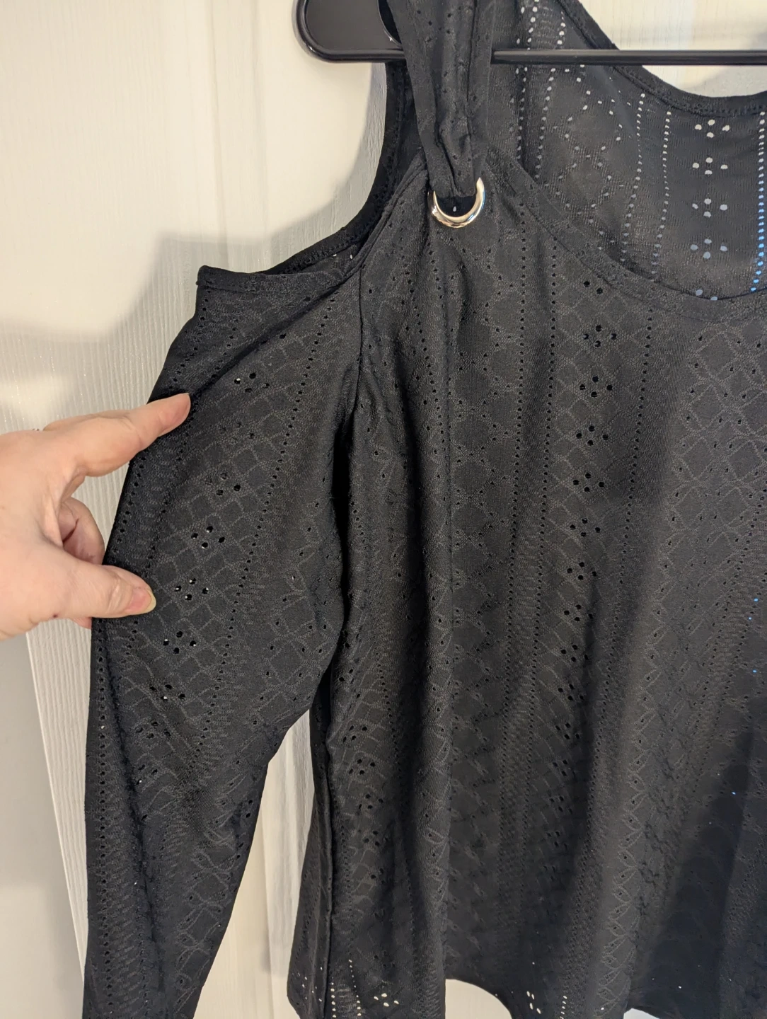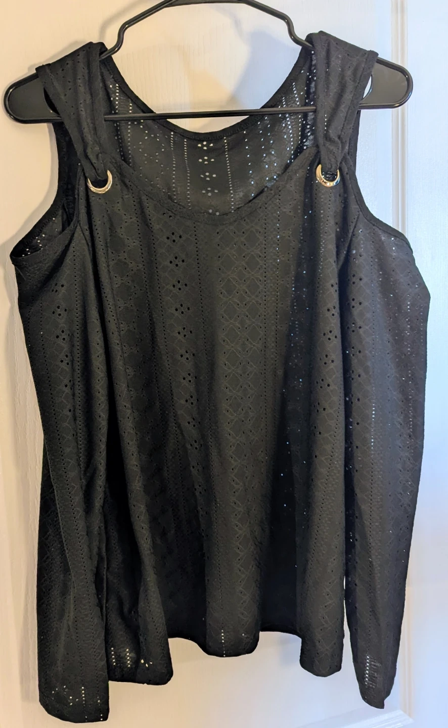 This is a black sleeveless top with an open knit design. It features decorative eyelets and a scalloped neckline.