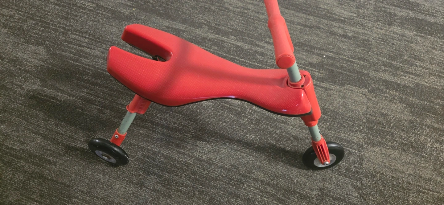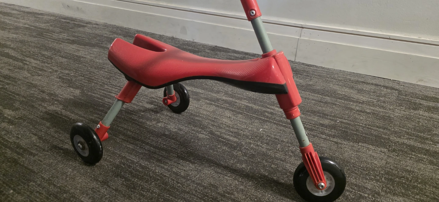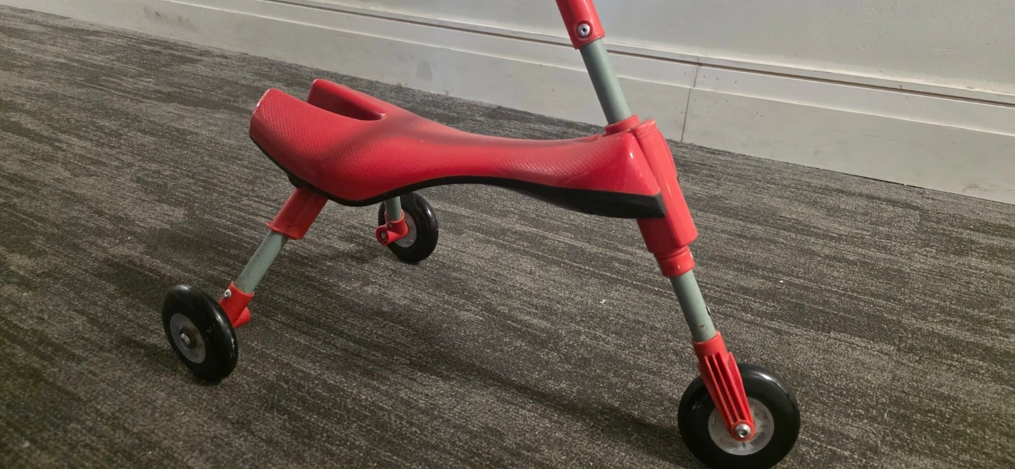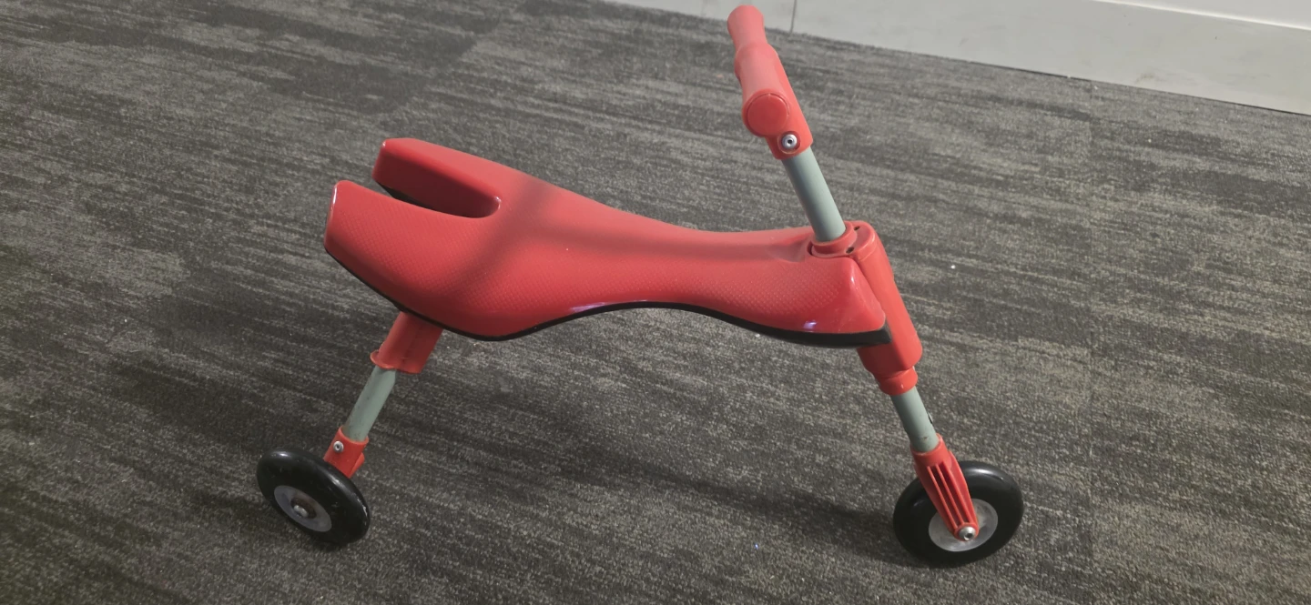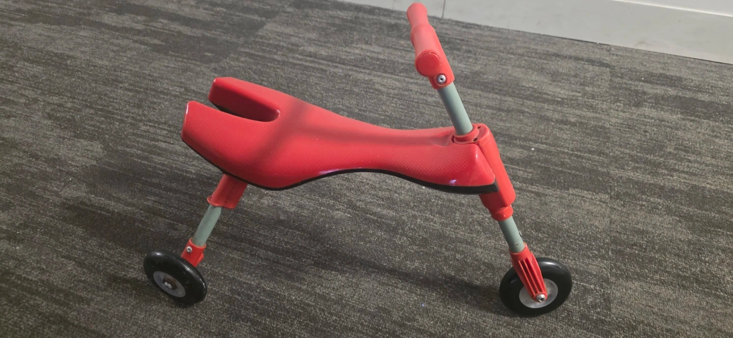 A bright red ride-on toy with three wheels and a comfortable seat. It's designed for little ones learning to balance and move around. This toy helps develop coordination and gross motor skills.