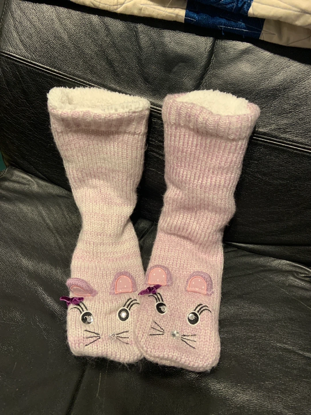 Keep your feet toasty with these super soft, sherpa-lined socks. They feature a cute cat face design with little ears and bows. Perfect for lounging around the house in a cold winter day.