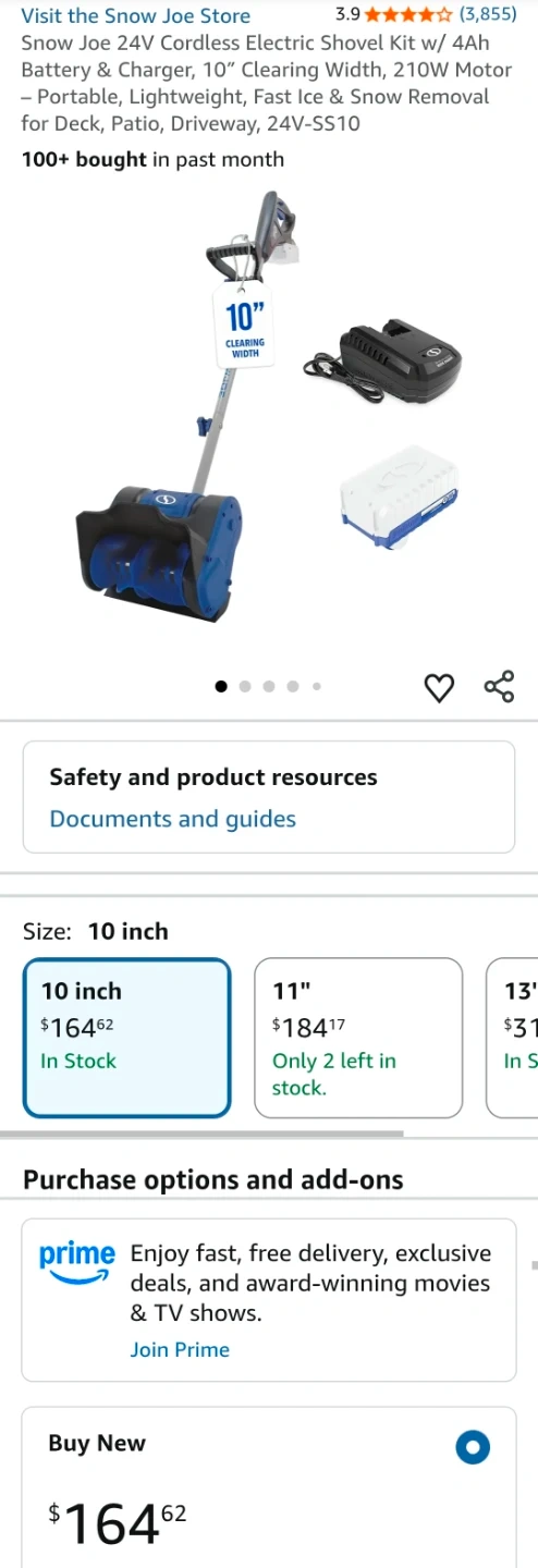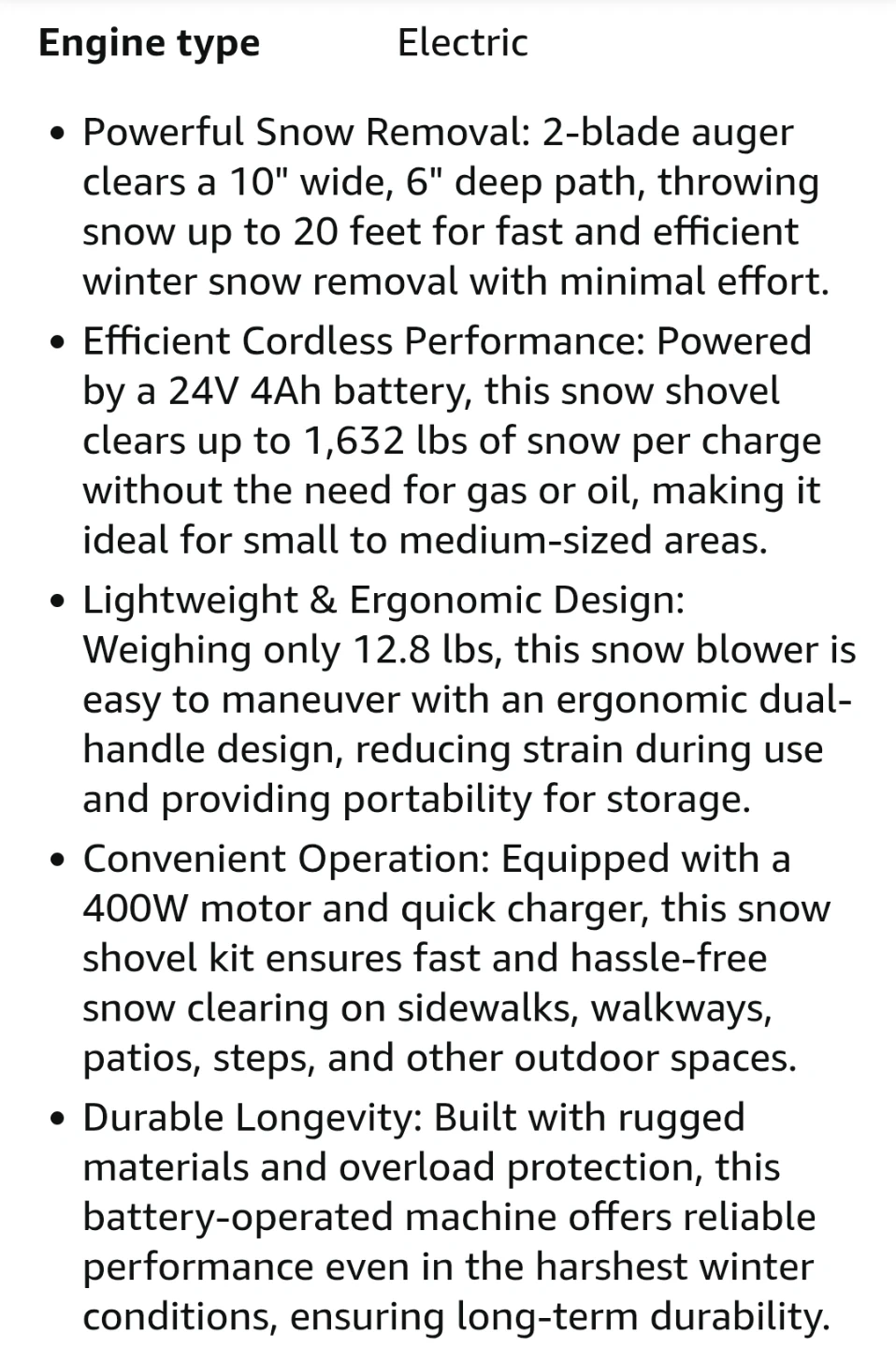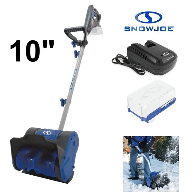 I'm selling a Snow Joe 24V cordless electric snow shovel, a lightweight and portable solution for clearing snow from your deck, patio, or driveway. This tool features a 10-inch clearing width and a 210W motor, making snow removal quick and easy. It runs on a 24V 4Ah battery and includes a charger.