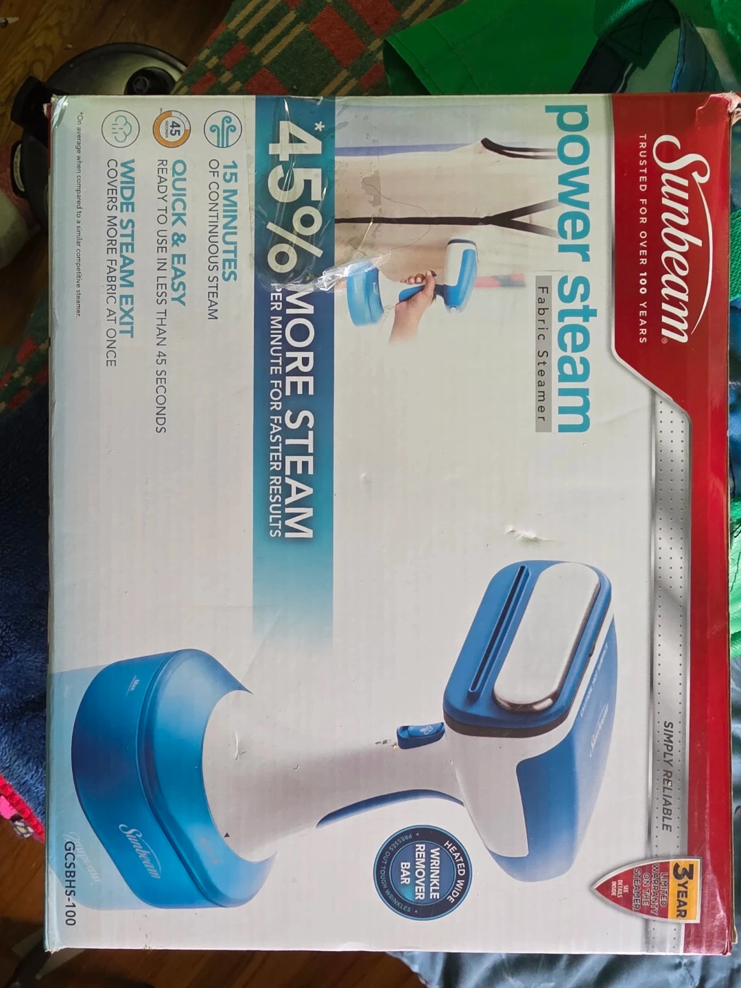 Sunbeam Power Steam fabric steamer. It's quick and easy to use, ready in less than 45 seconds. Offers 15 minutes of continuous steam for faster results. Effectively sanitizes and refreshes fabrics, removing odour and killing dust mites and bedbugs.