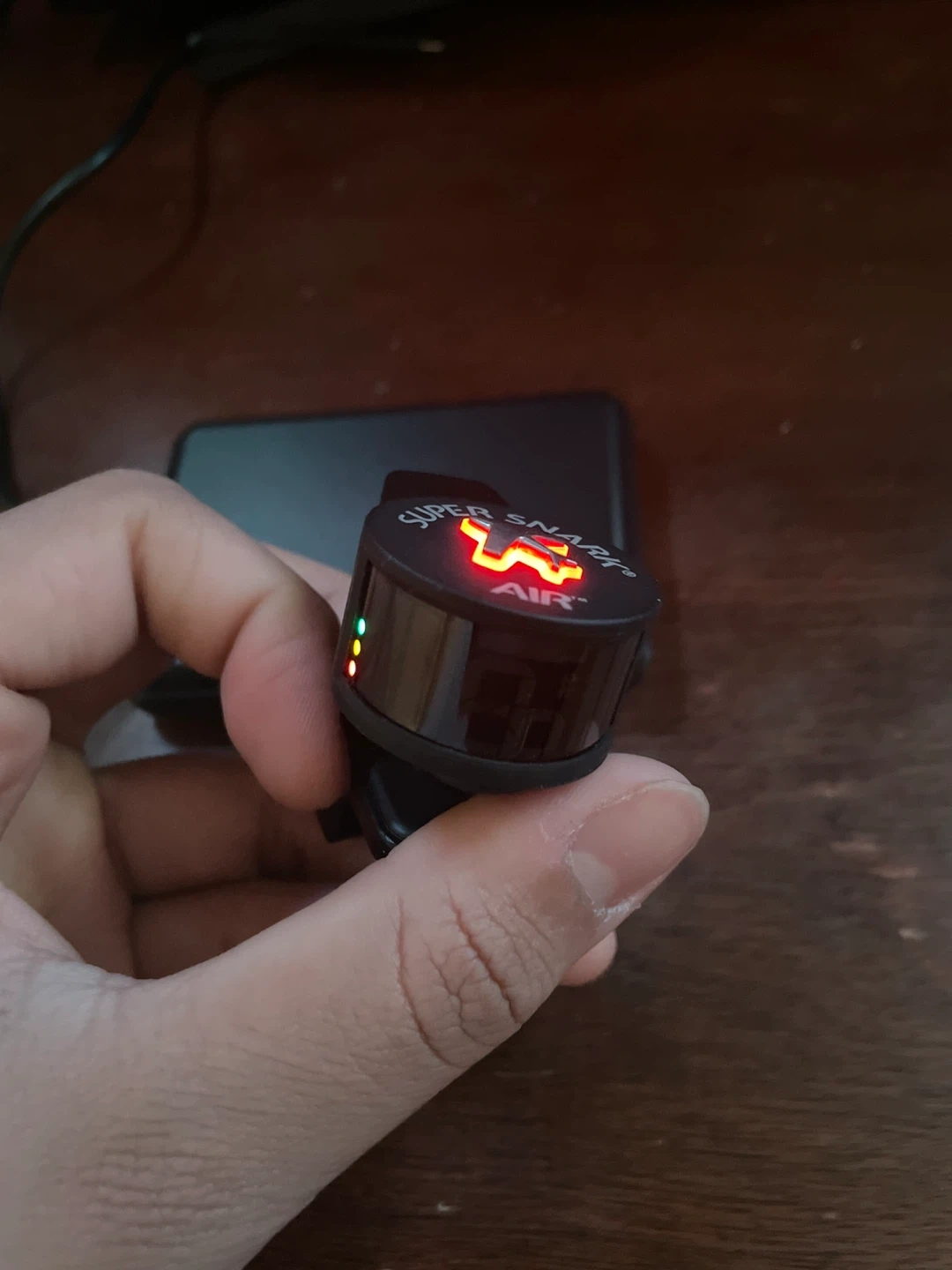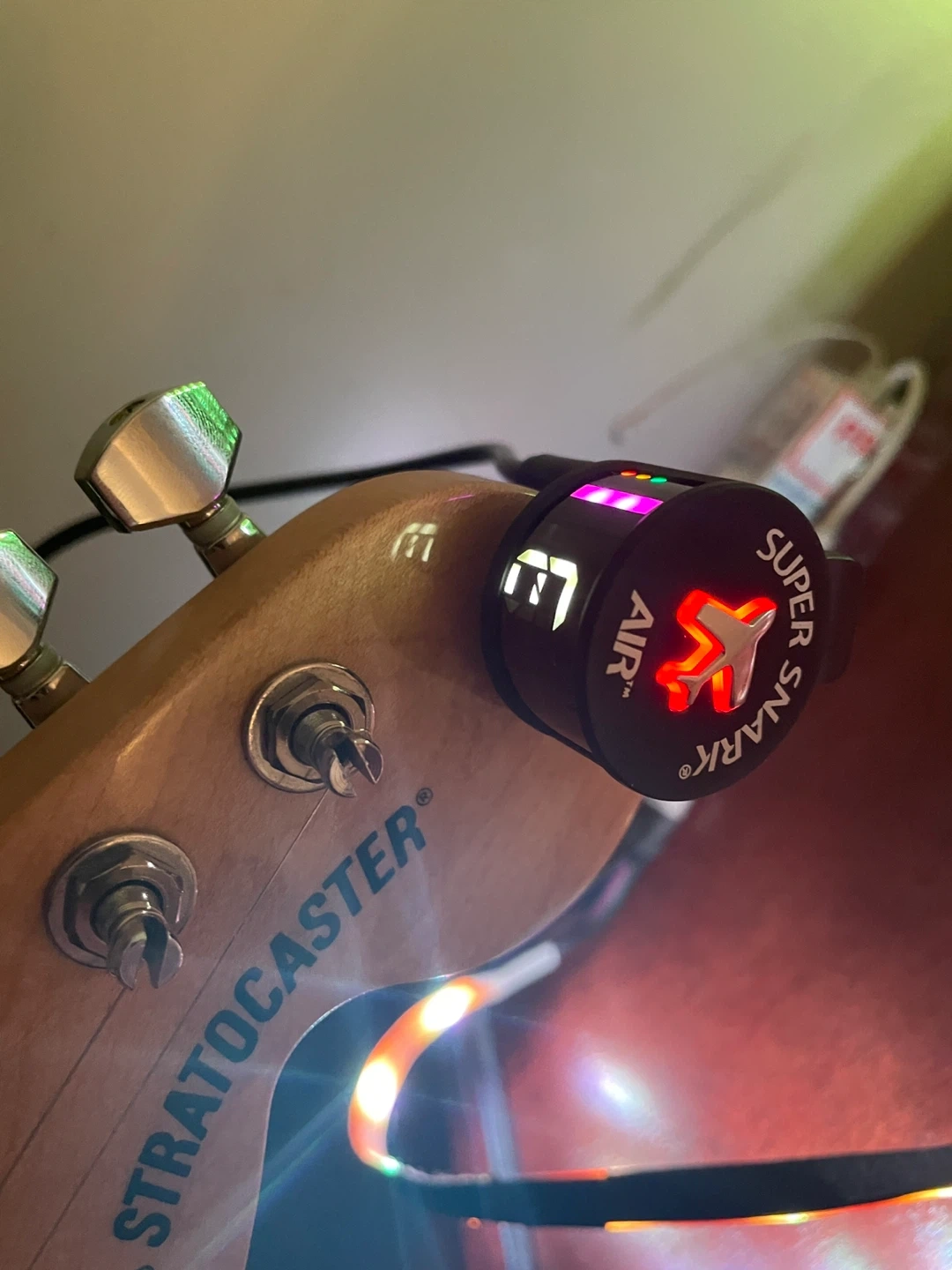 This is a Super Snark Air guitar tuner. It's black and displays tuning information with bright LEDs. Includes a USB charging port.