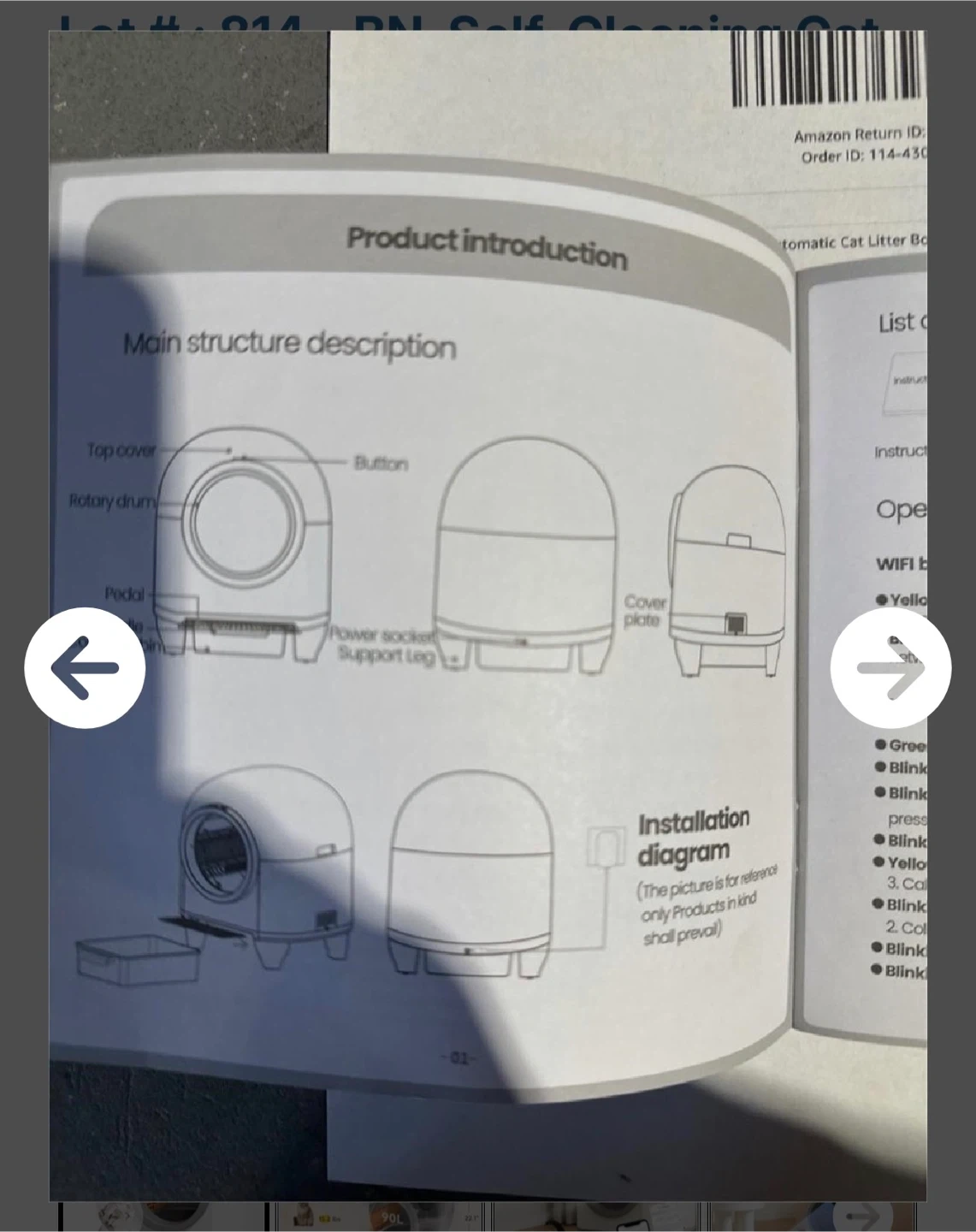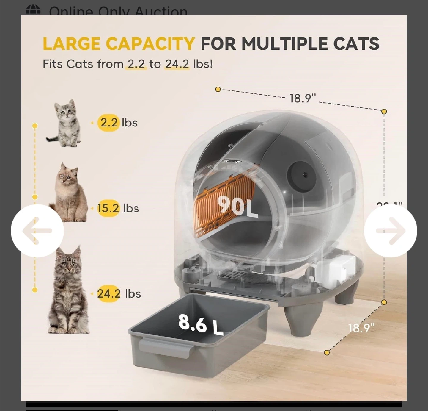 This automatic cat litter box offers app remote control and a large 90L capacity, fitting cats from 2.2 to 24.2 lbs. It features a bottom gravity sensor and an infrared pyroelectric sensing device for safety. The waste bin has an 8.6L capacity.