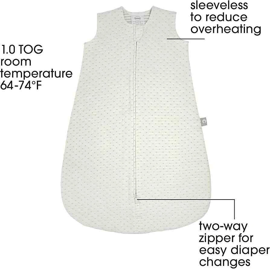 This is the 1.0 TOG version, perfect for year-round sleeping comfort in moderate room temperatures of 64-74F. Made from 100% soft cotton with a 2-way zipper for easy diaper changes.