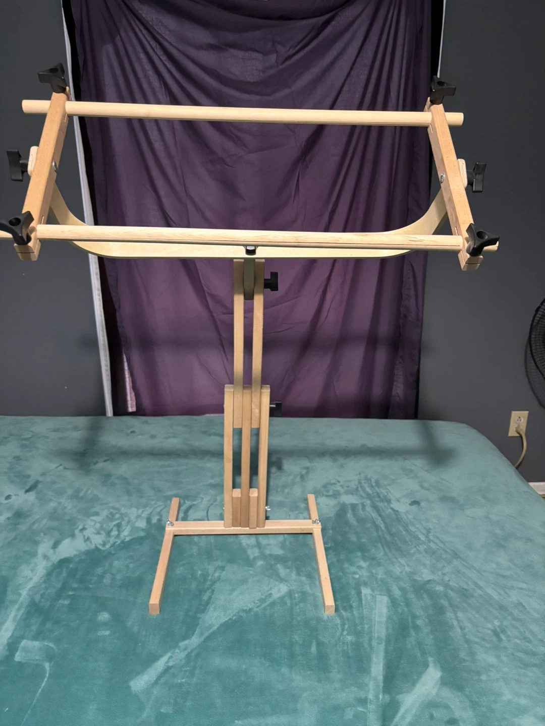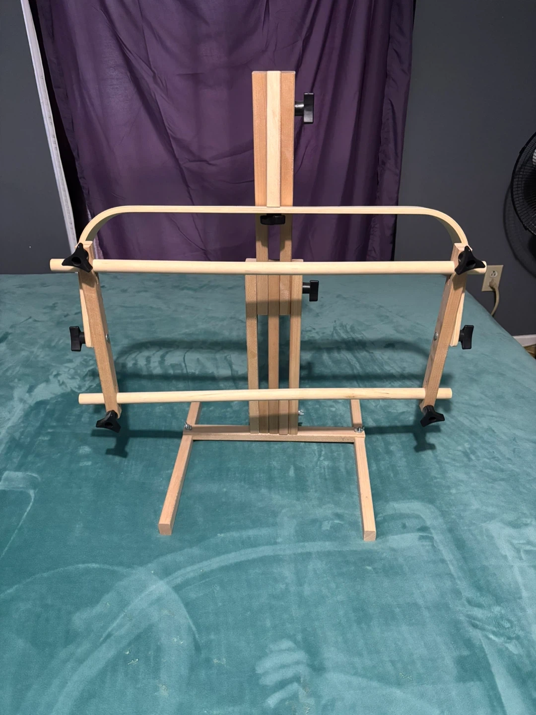 This adjustable wooden embroidery stand is made from light-coloured wood. It's perfect for holding your embroidery projects while you work. Adjustable height.