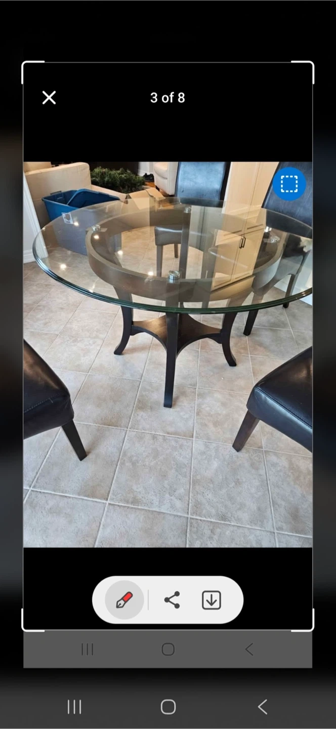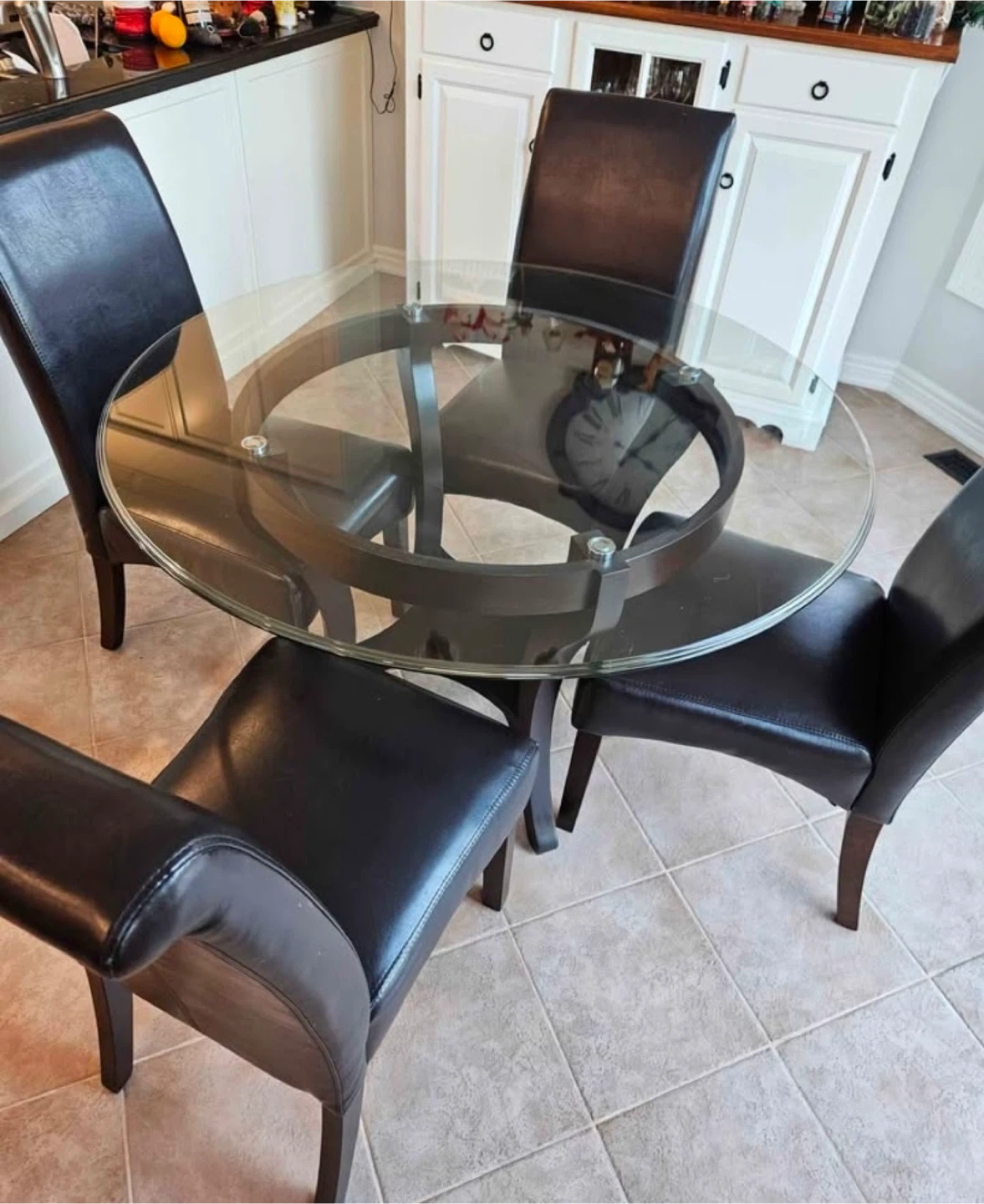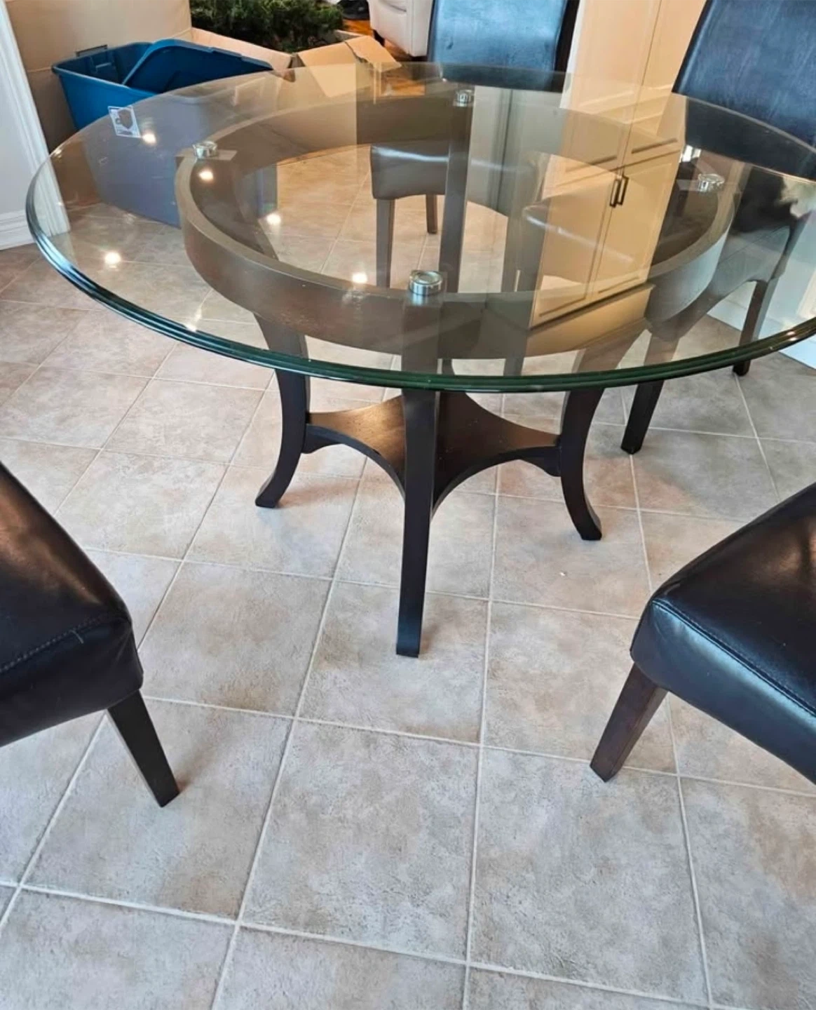 This 48 inch glass table from Stoney Creek furniture is tempered glass with a bevelled edge. A few scratches on it, the base is wood and in very good condition very solid pick up in Burlington Walker line and country club