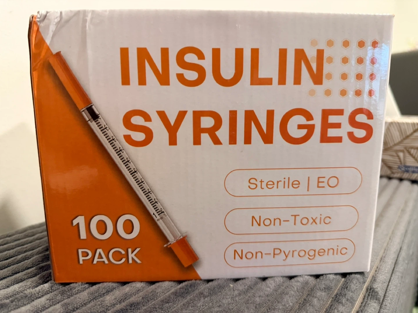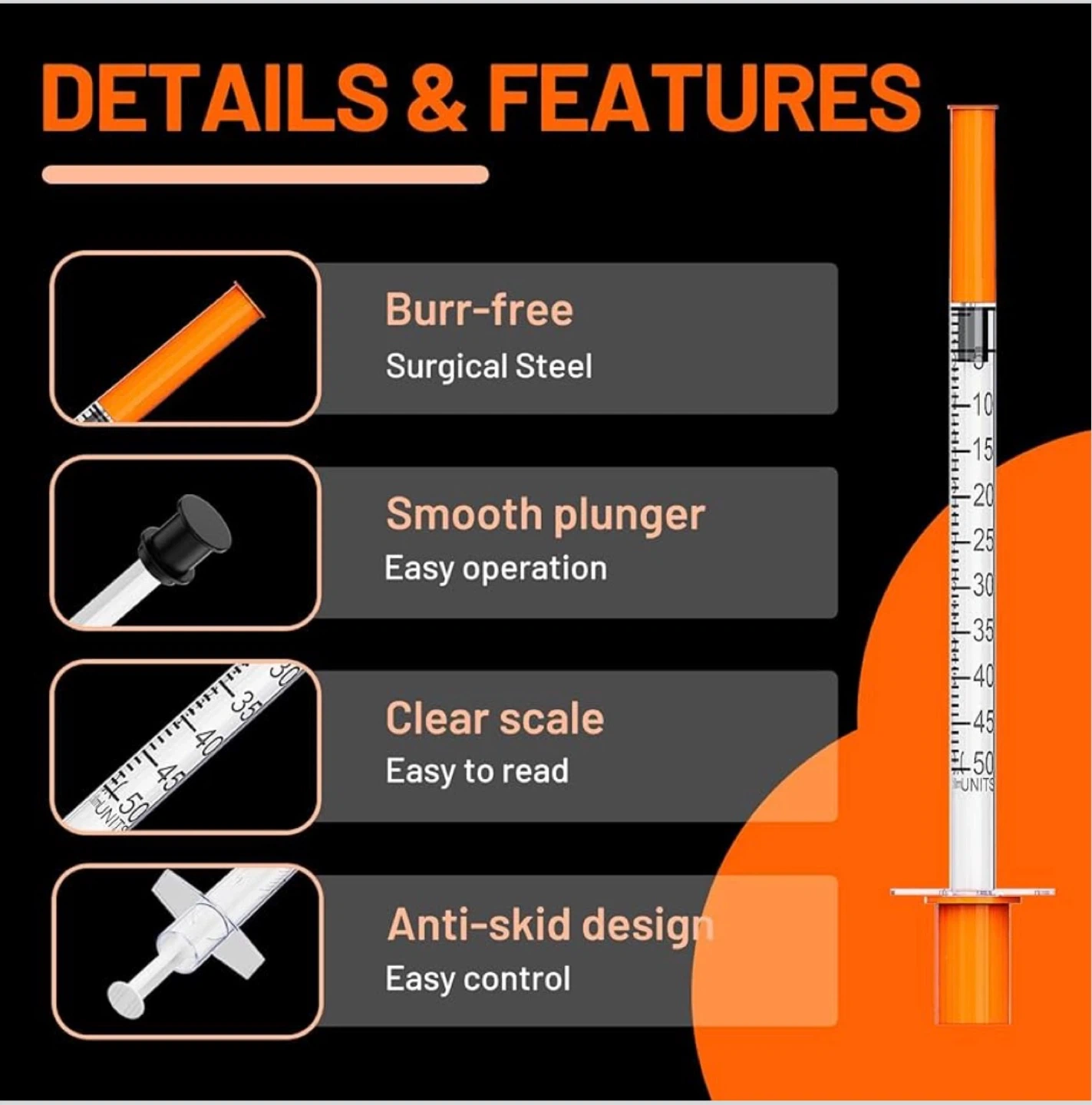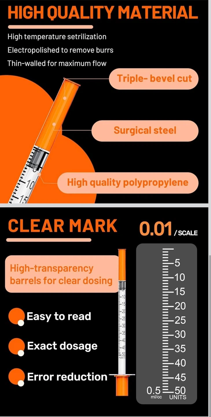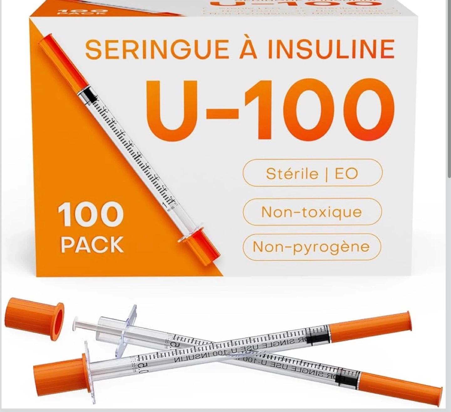 This is a 100-pack of U-100 insulin syringes. They are sterile, non-toxic, and non-pyrogenic. Features include burr-free surgical steel needles, smooth plungers for easy operation, and clear scales for accurate dosing. The anti-skid design offers easy control.π