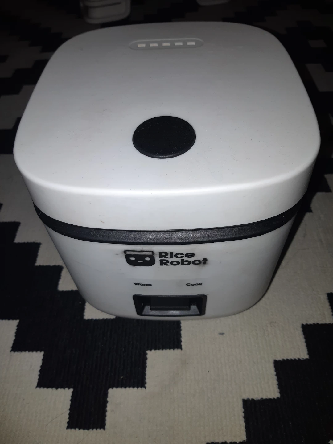 Compact white Rice Robot mini rice cooker. It has 'Warm' and 'Cook' settings. This appliance is great for making small batches of rice for one or two people.