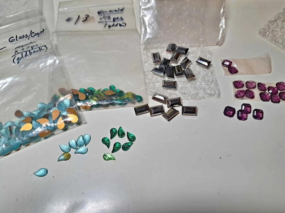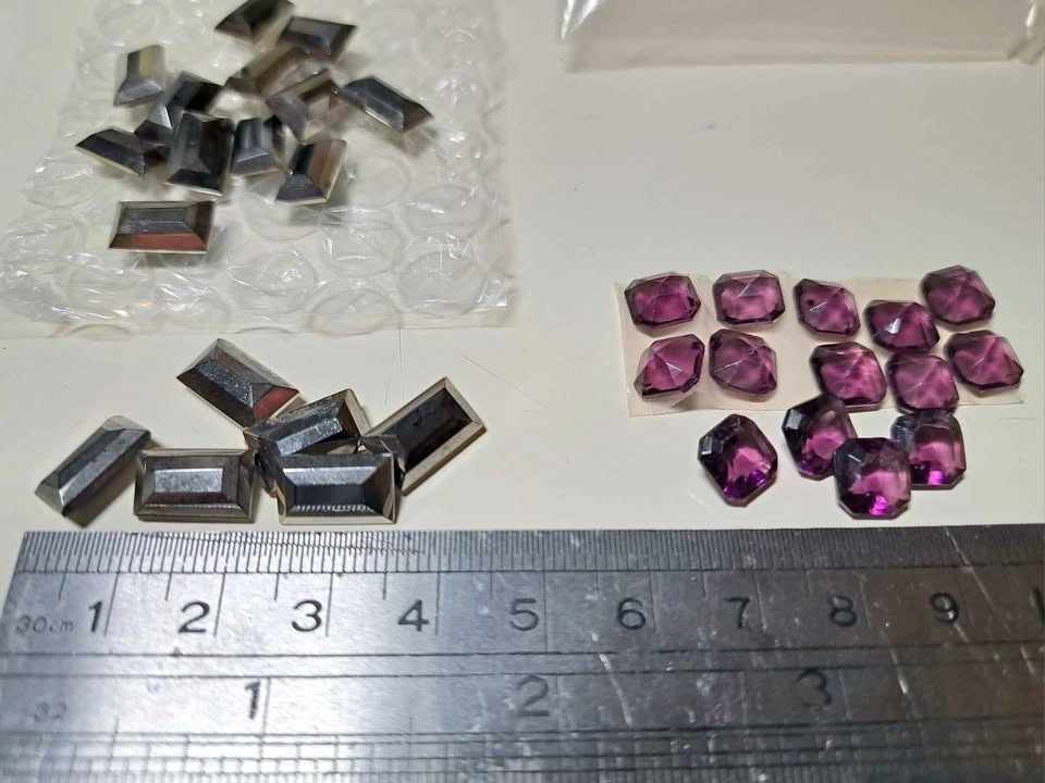 Vintage crystal leaf shapes to glue or press to clay. 'Hemetite' finish on pressed glass good quality. Pressed glass- deep amythest colour good cut, 7-8mm size for settings or clay.
