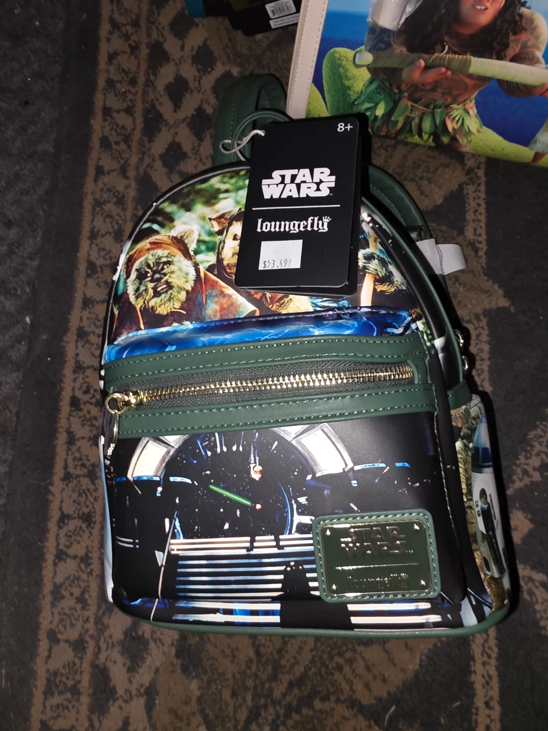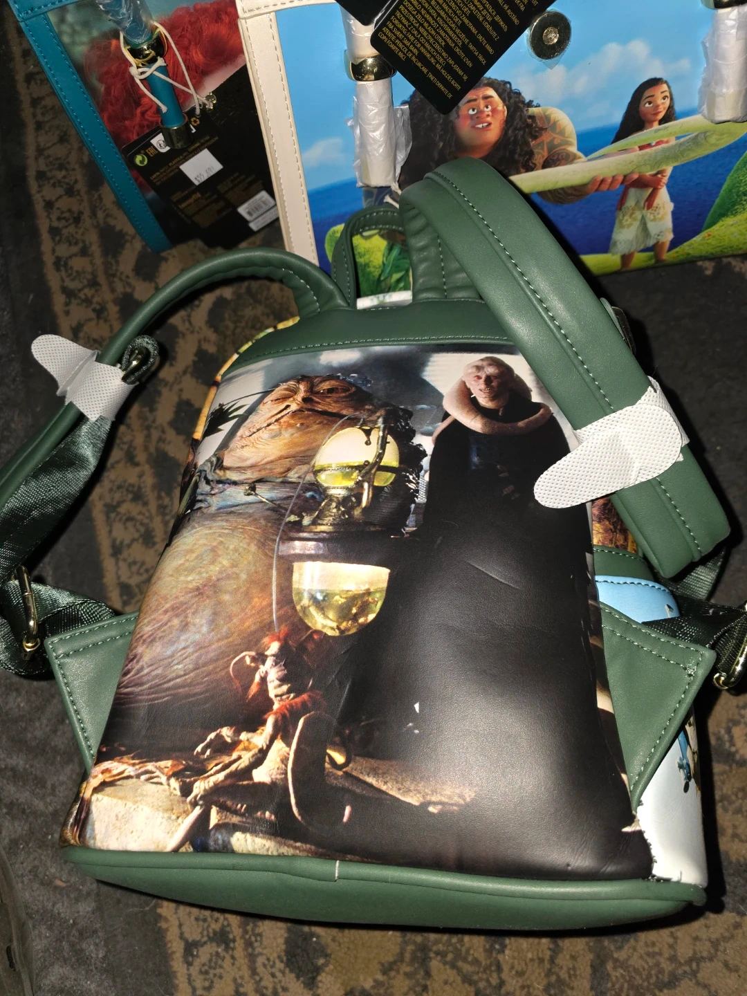New Loungefly Disney Bravery and Moana themed handbags. Each bag has a printed design featuring characters from the movies. Teal trim on the Bravery bag and blue trim on the Moana bag.