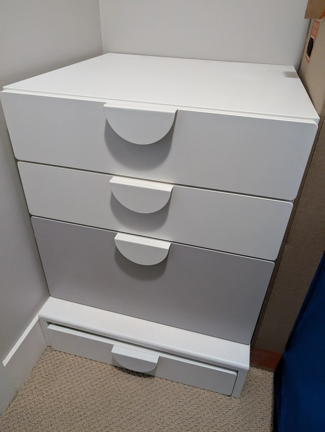The front of one drawer is grey. Everything else is white. Optional handles have already been installed.