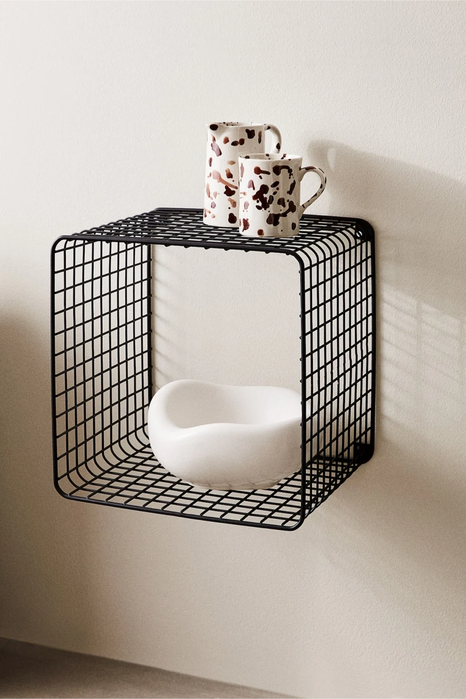Wall shelf in metal wire for organizing and displaying everyday and decorative objects. Discreet mounting with screw holes at back. Depth 12 in. Width 14 x 14 in.