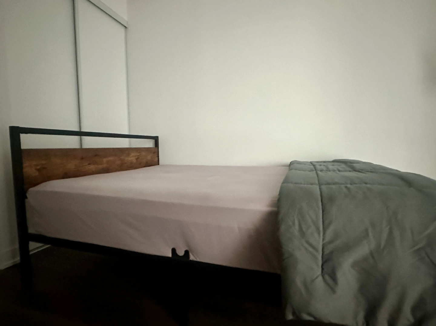 Double bed frame with a wooden headboard. Includes metal slats.