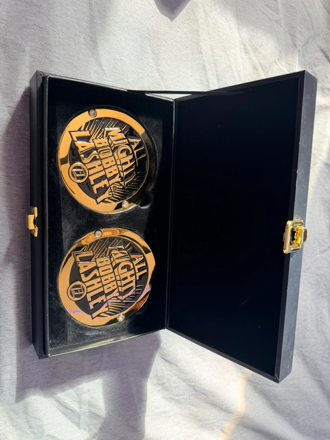 This set includes two championship belts. It's housed in a black display case with a gold latch. Perfect for wrestling fans!