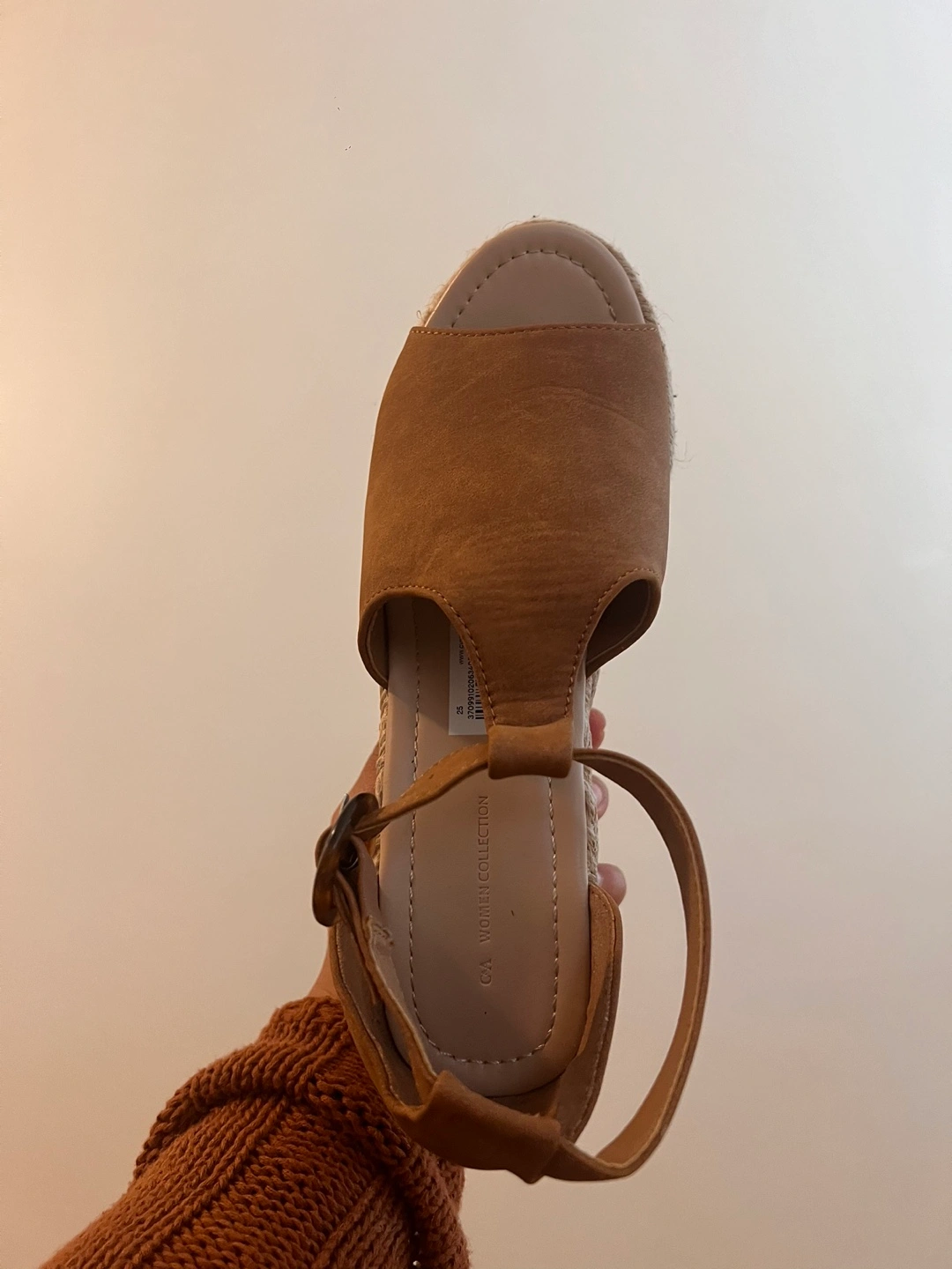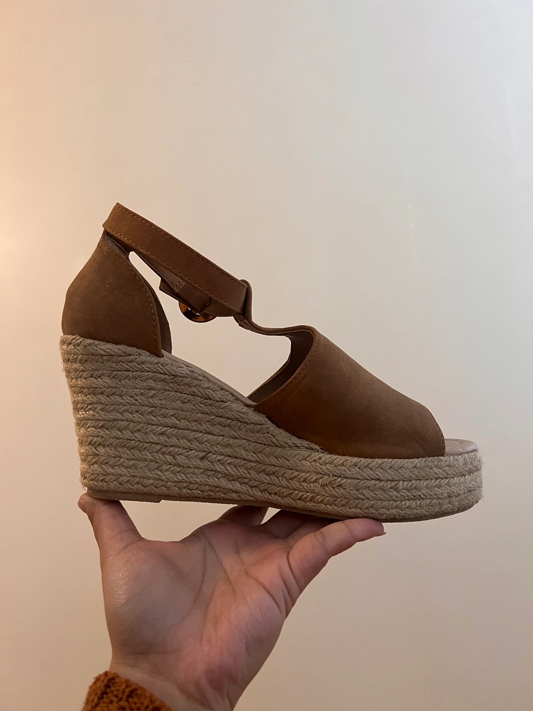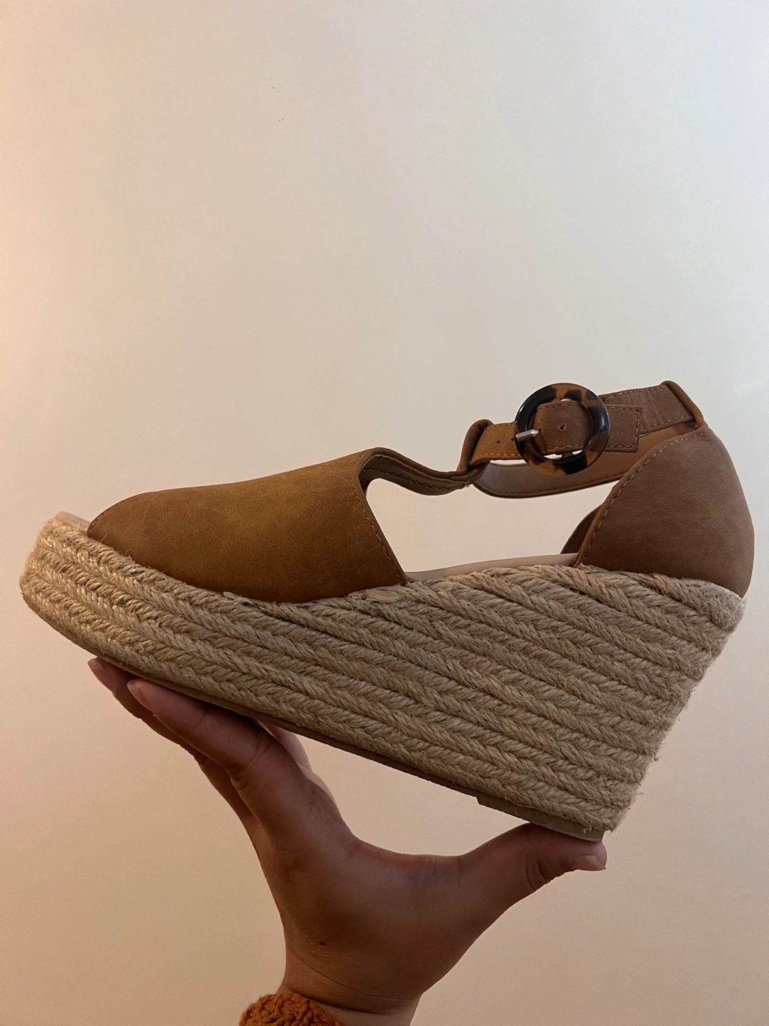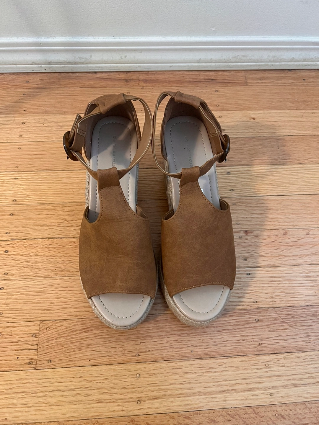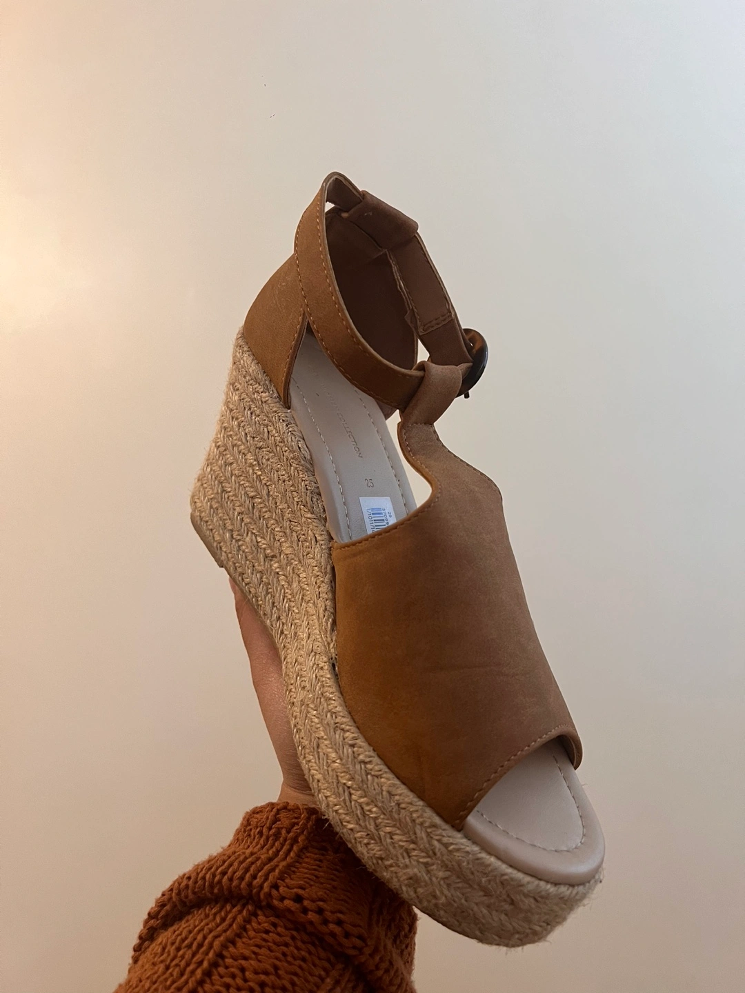 113Brown espadrille wedges with an ankle strap and buckle. Size 8