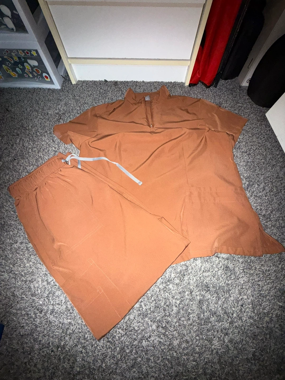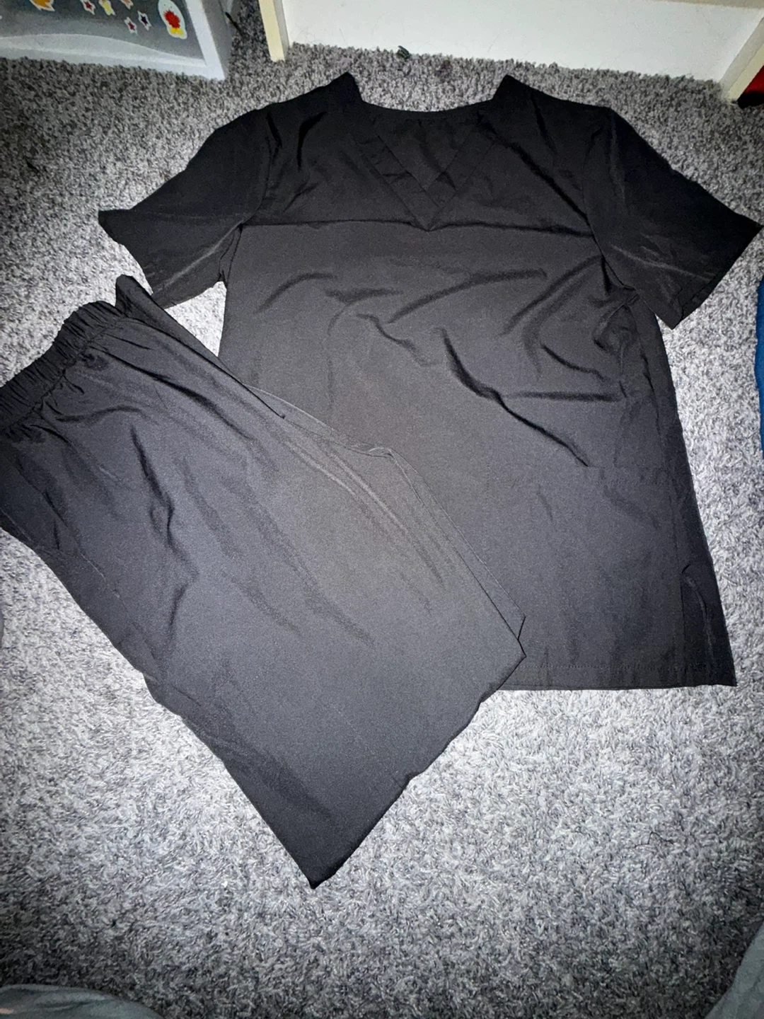 Multiple sets of scrub tops and bottoms in various colours. These are comfortable and durable for everyday wear. Available in black, red, green, orange, and purple.