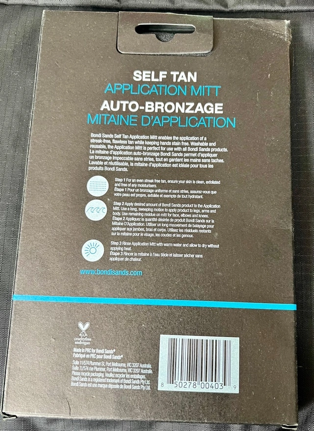 Achieve a flawless, streak-free tan with this Bondi Sands Self Tan Application Mitt. This mitt ensures even distribution of self-tanning products for a professional-looking result every time. It is new, still in the original packaging. Double-sided, washable, and reusable. Comparable mitts are selling for about $15.