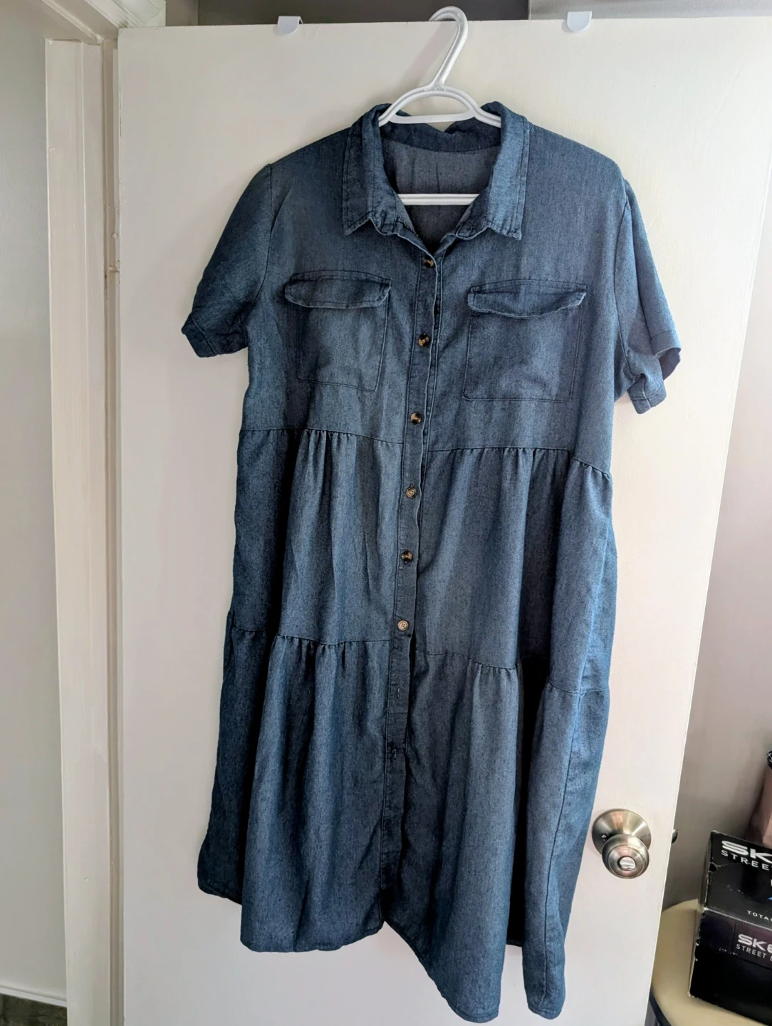 A short-sleeved denim shirt dress with button-up front and two chest pockets. It features a tiered skirt design. Made from denim material.