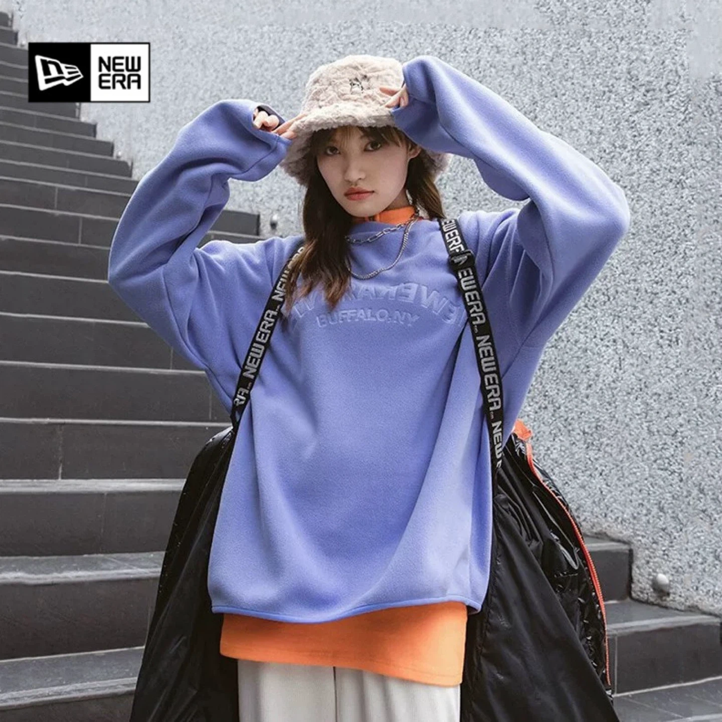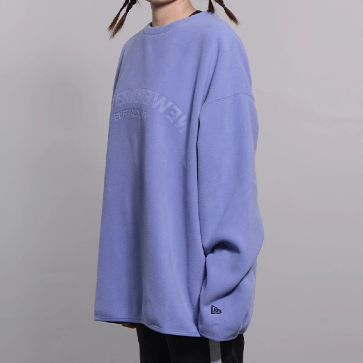 A comfortable New Era crewneck sweatshirt in a lovely shade of purple. It features embossed lettering that reads "NEW ERA BUFFALO, NY". Made with soft material for all-day wear. This sweatshirt is perfect for cooler weather.