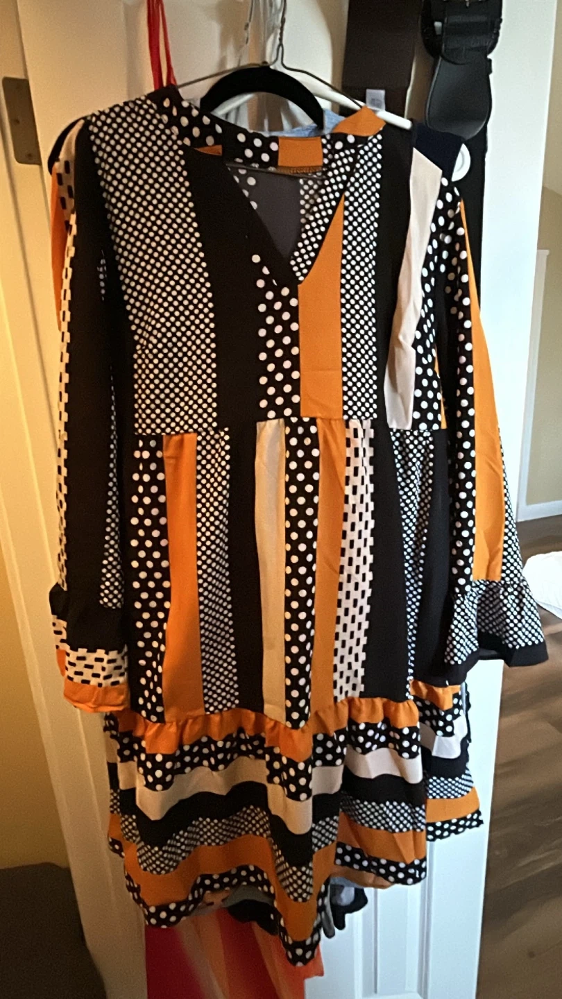This fun mini dress features a vibrant print with stripes and polka dots. It's designed with a V-neck and ruffled hem for a playful look. Perfect for casual outings or a day out!
