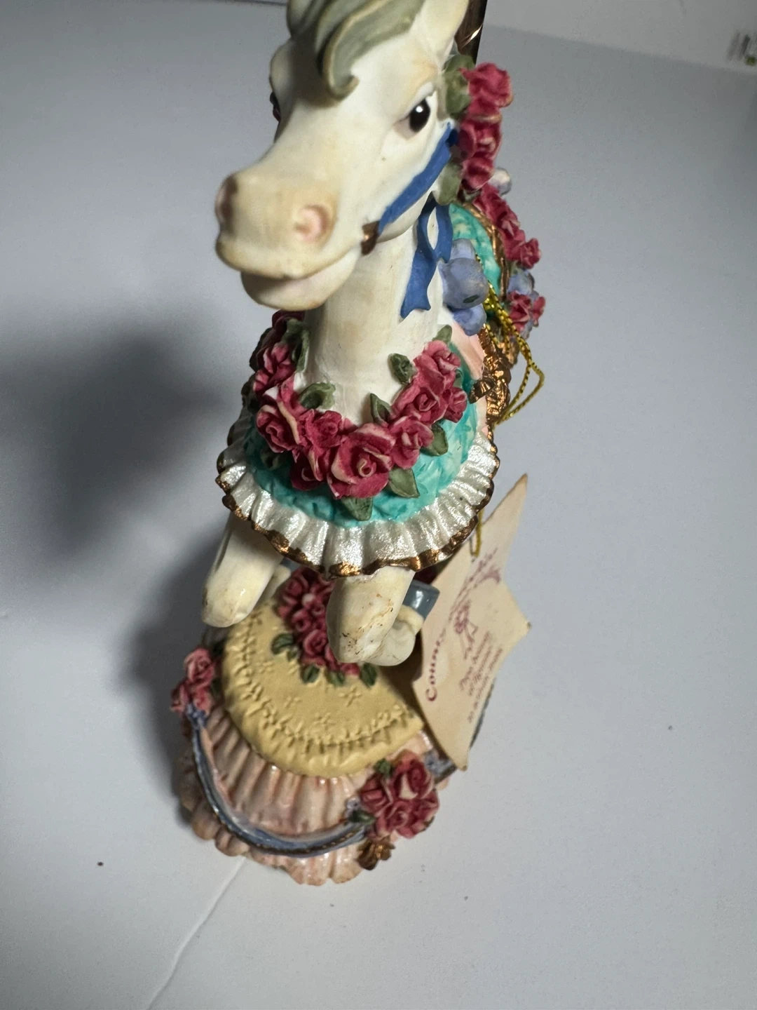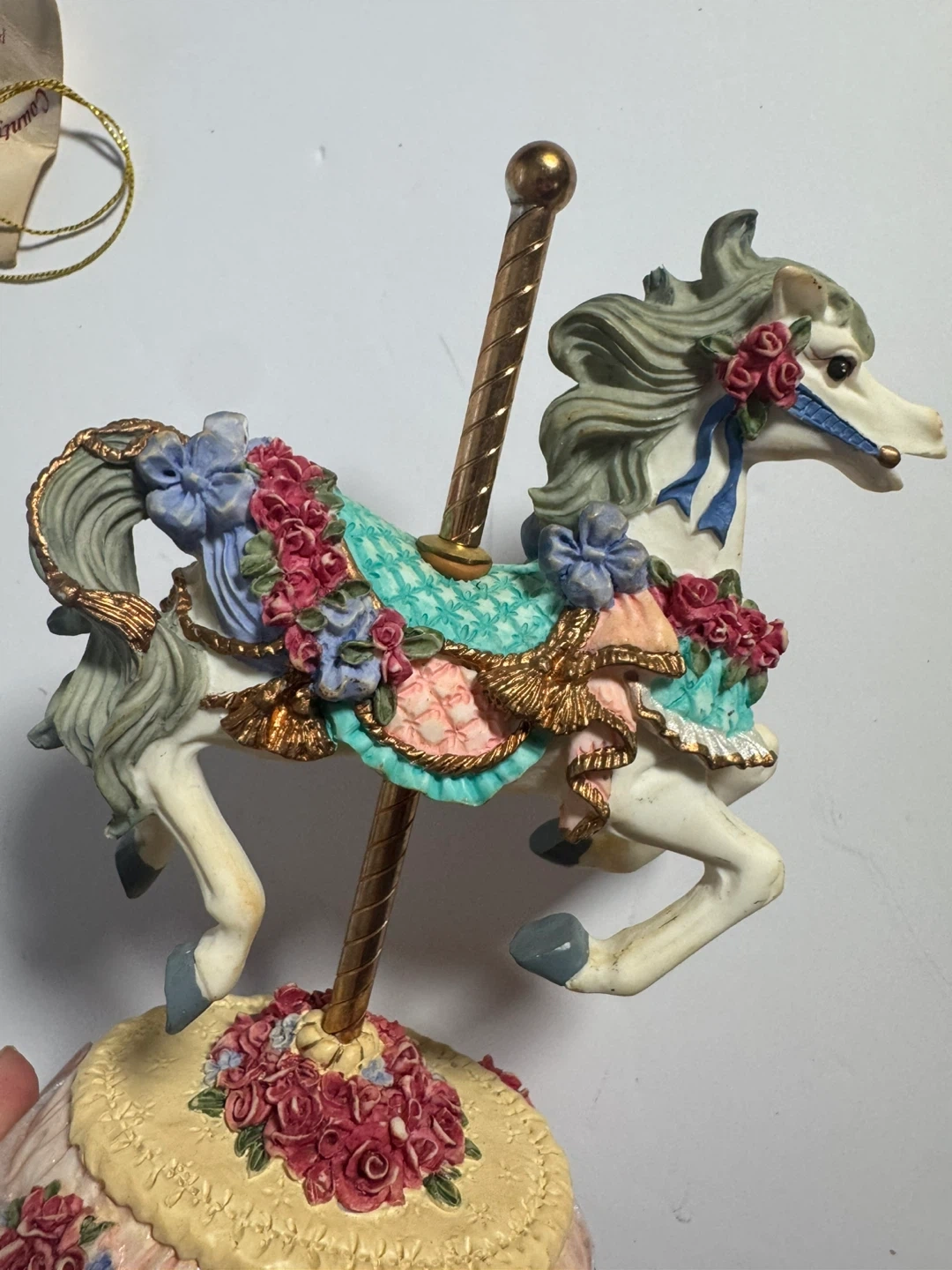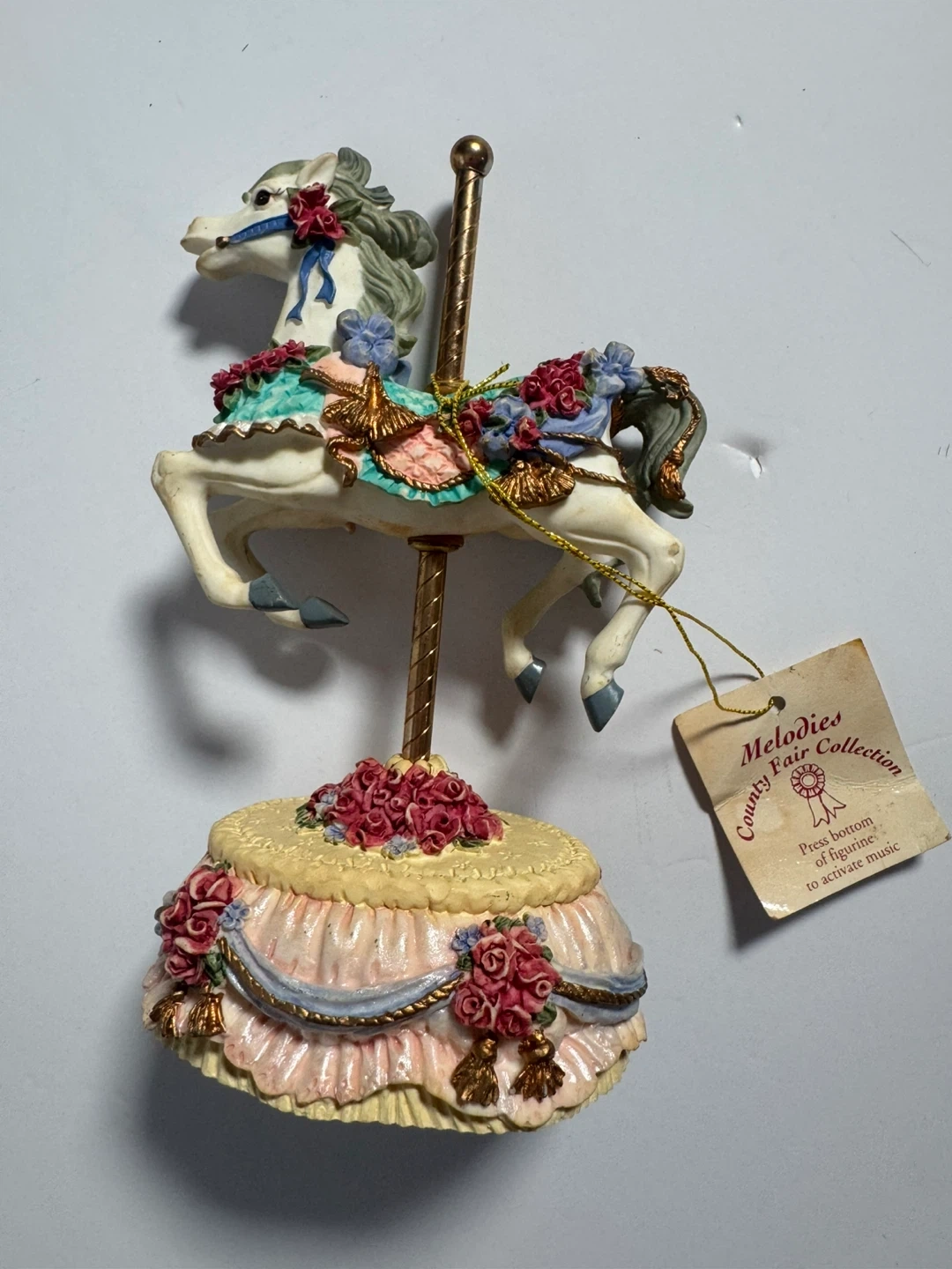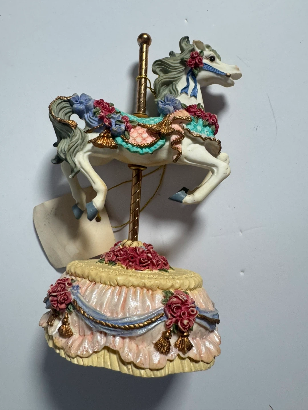 This charming carousel horse music box is from the Melodies Fair Collection. It's decorated with beautiful floral accents and plays music when the bottom is pressed. A lovely decorative piece!