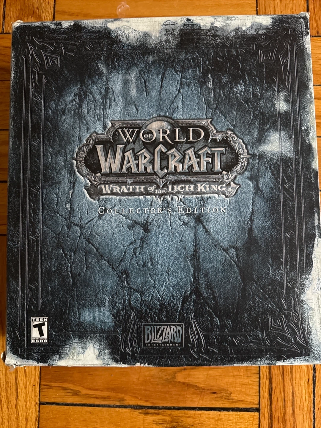Used - Collector's Edition box for World of Warcraft: Wrath of the Lich King. Includes PC game and Blizzard Entertainment branding. Rated T for Teen by ESRB.