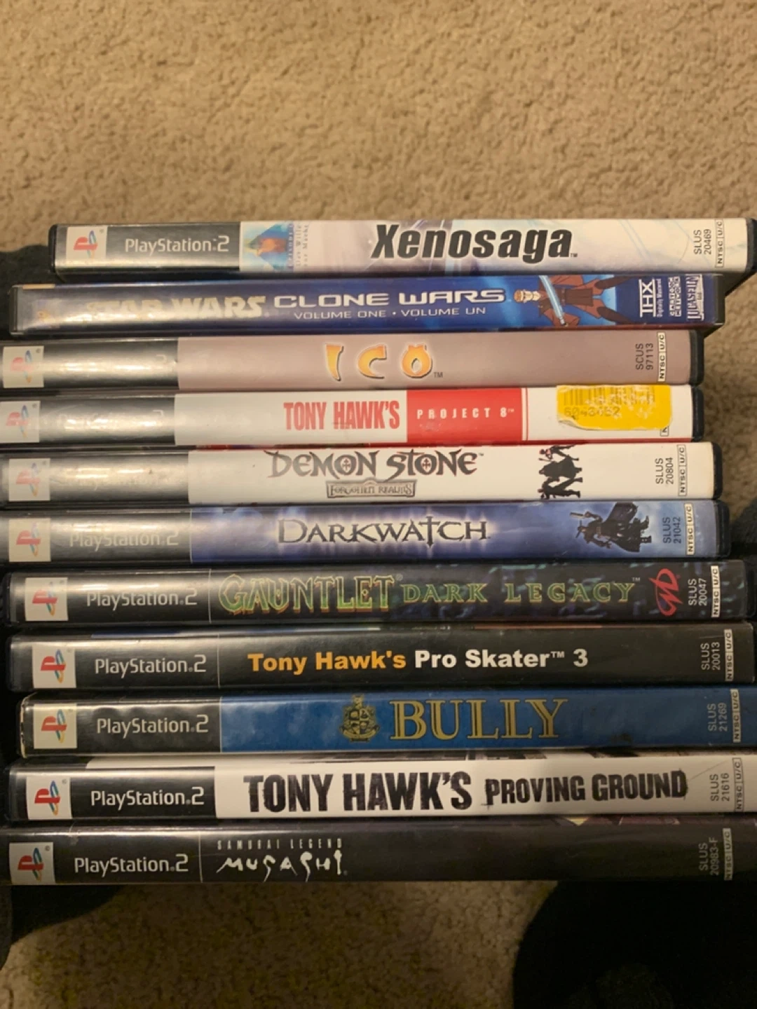 Collection of PlayStation 2 video games, including Xenosaga, Star Wars Clone Wars, Tony Hawk's series, Demon Stone, Darkwatch, Gauntlet Dark Legacy, Bully, and Musashi: Samurai Legend. These are PS2 disc titles. They're all ready for a new owner to play