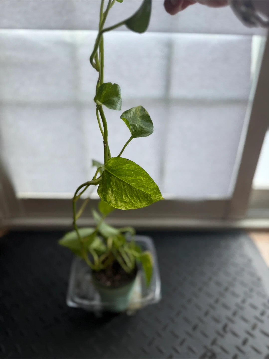 A healthy Pothos plant with green and yellow variegated leaves. It's potted in a pale green plastic pot with a clear plastic saucer. This plant is known for its easy care and trailing vines.
