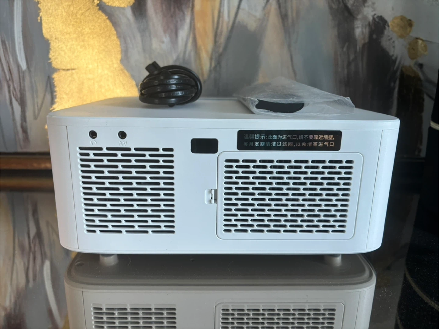 This VEEMI projector features a 6-inch LCD screen with 1920*1080 resolution. It has a light source brightness of 4800 Lumens and a contrast ratio of 2200:1. It also includes a Bluetooth remote control and comes with its power cord. The voltage range is 100-240V.