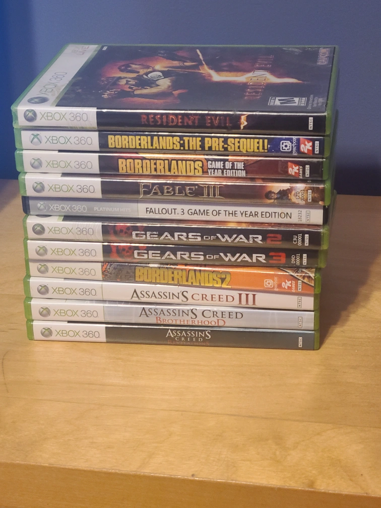 Collection of Xbox 360 games including Resident Evil, Borderlands (Pre-Sequel & Game of the Year Edition), Fable III, Fallout 3 Game of the Year Edition, Gears of War 2 & 3, and Assassin's Creed III, Brotherhood, and the original Assassin's Creed. These are all disc-based games for the Xbox 360 console. A great collection for any gamer!