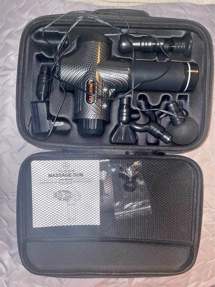Includes: Aldom 30-Speed Massage Gun (Carbon Fiber), all 8 original massage attachments, original protective travel case, wall charger, and user manual.