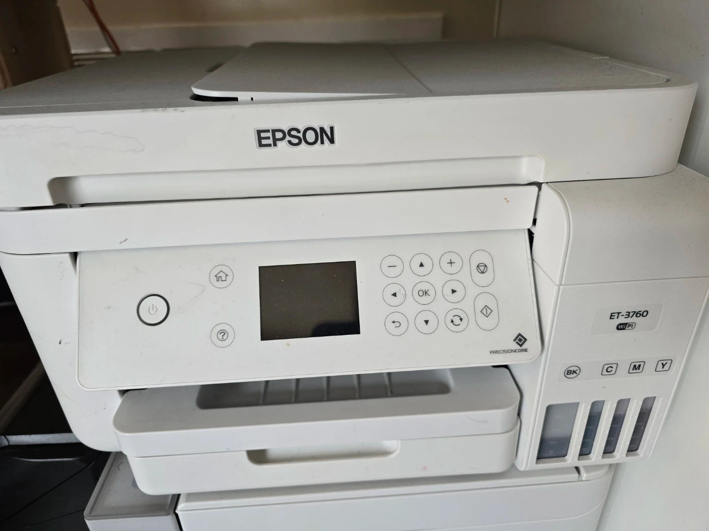 White Epson ET-3760 EcoTank printer. Features PrecisionCore technology and Wi-Fi connectivity. Useful for home or small office printing needs.