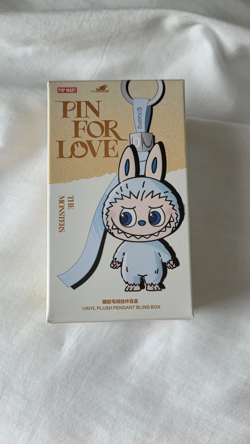 This is a Pop Mart Pin For Love blind box featuring a vinyl plush pendant from The Monsters collection.