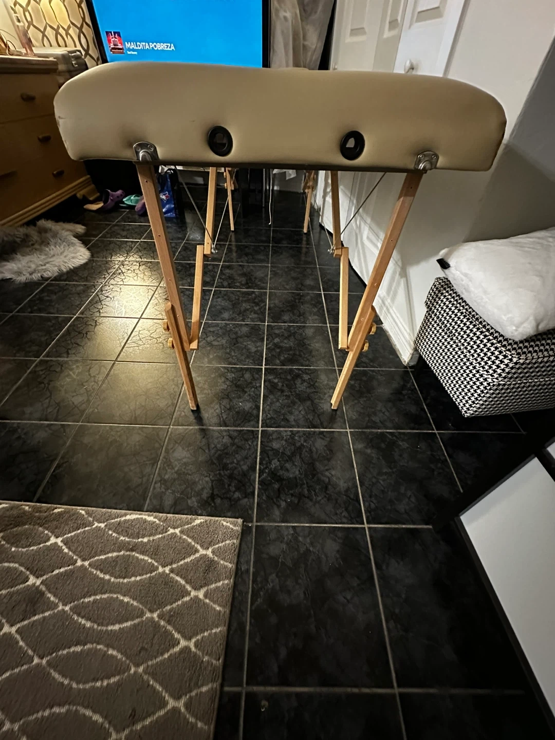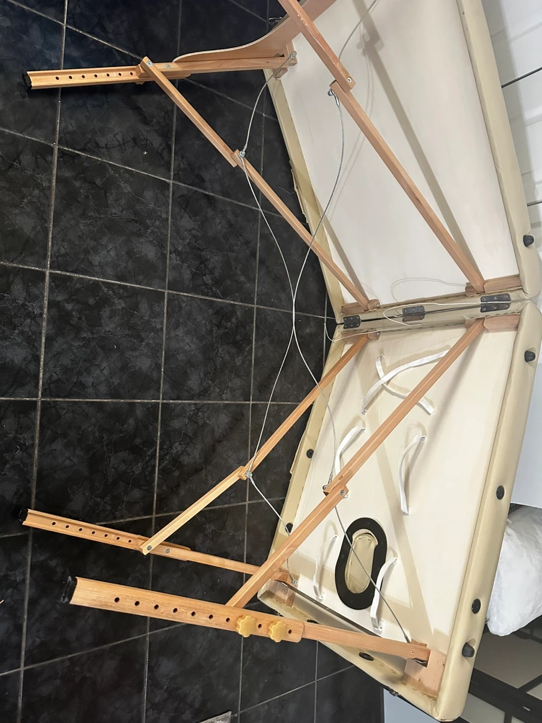 This is a portable massage table. It's beige and has an opening for resting the face. The wooden legs are height adjustable. It's a sturdy table, ideal for professional or home use.