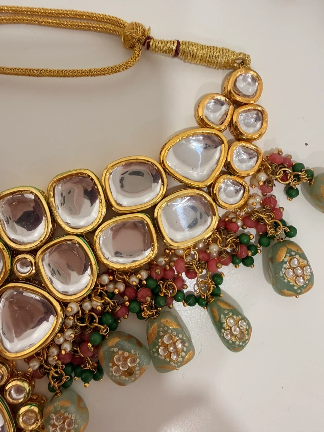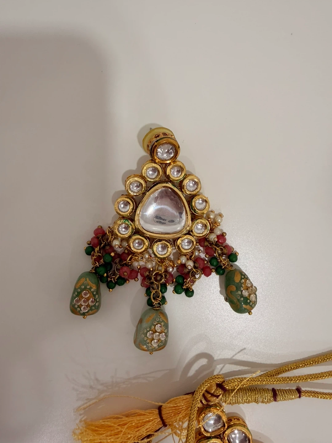Beautiful Indian jewellery set featuring a Kundan necklace, matching earrings, and a tikka. With clear stones, red and green beads, and delicate pearls. The gold toned metal has intricate painted details. Perfect for special occasions.