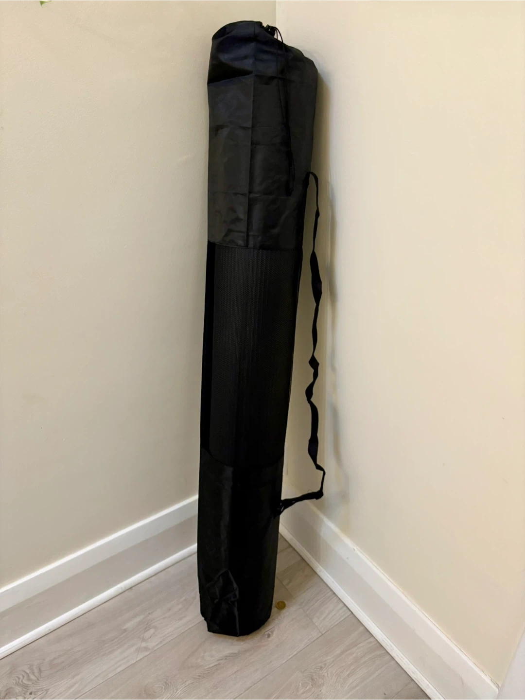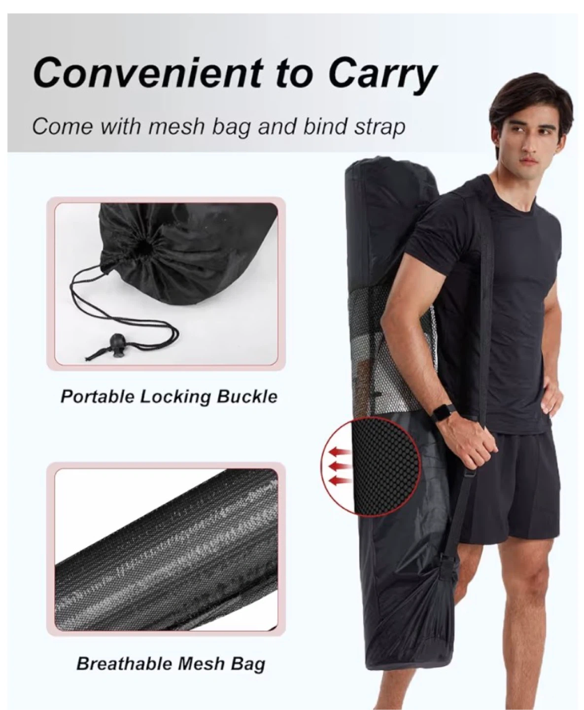 The mat includes a carrying bag for easy transport. It's large enough for yoga, pilates, or fitness workouts.
