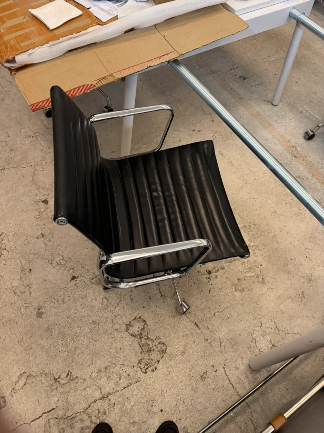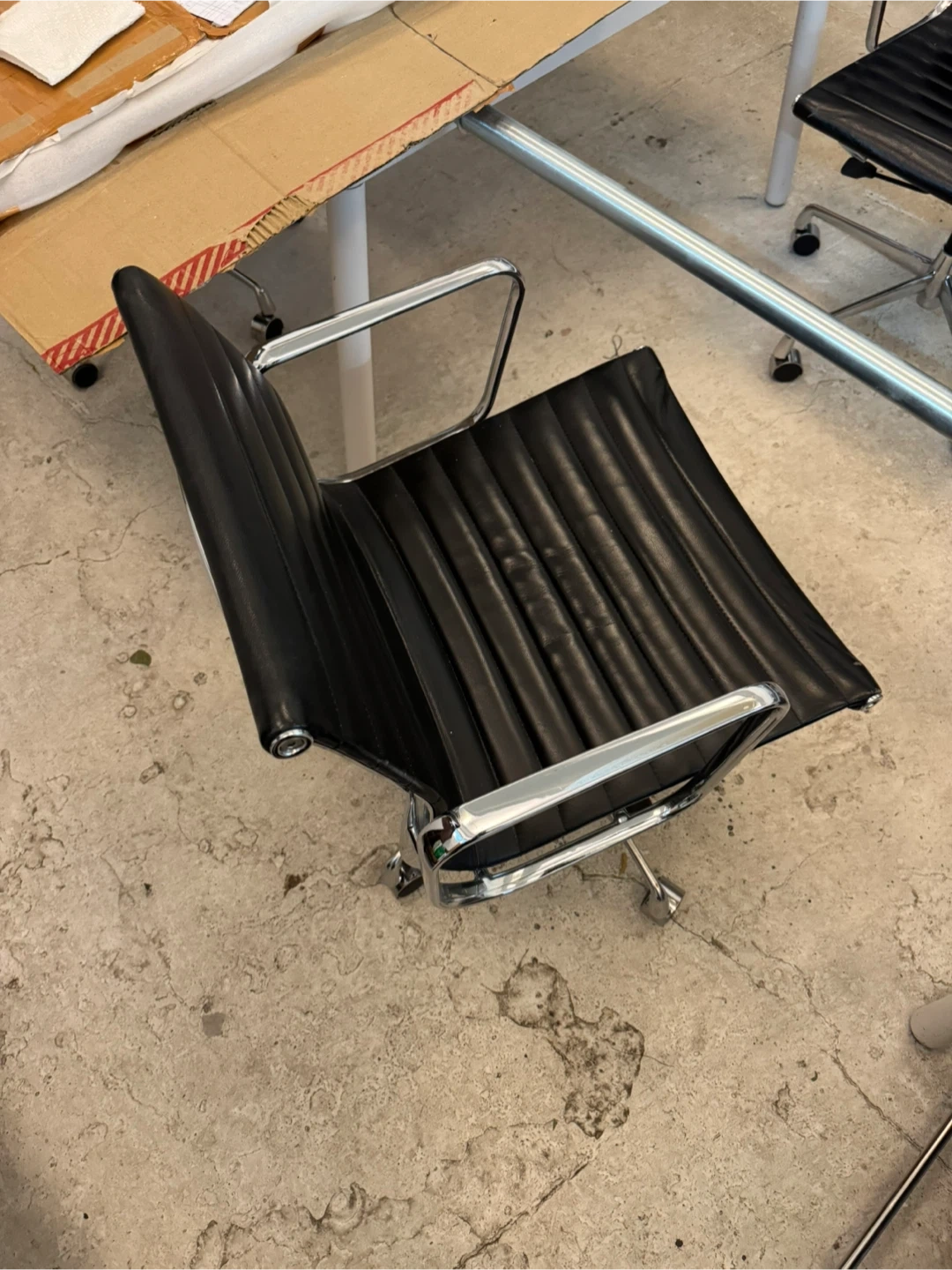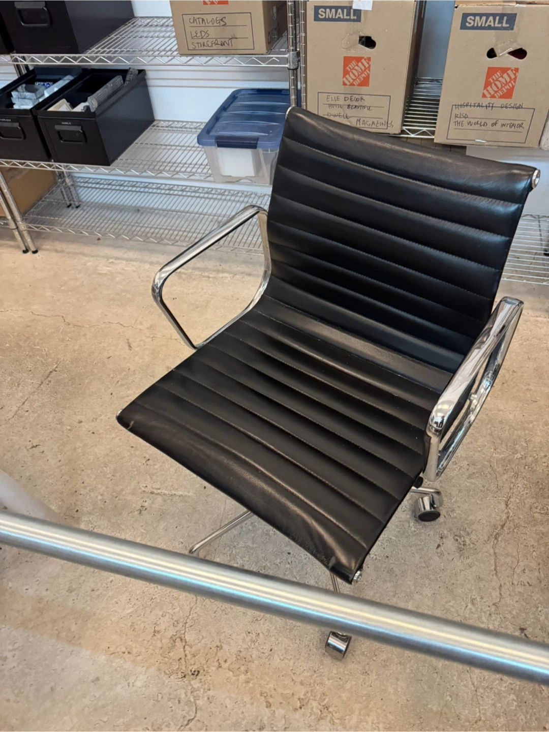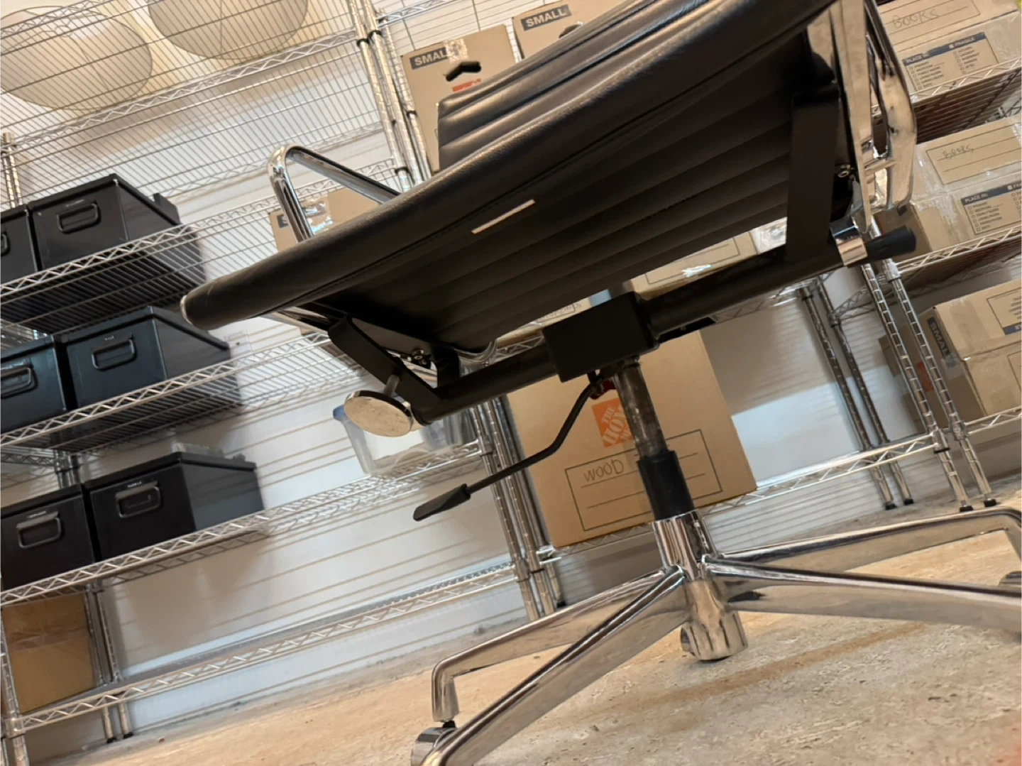 Eames design with chrome and black leather. It's a comfortable and stylish addition to any workspace. The chair has a durable leather upholstery and a sturdy base with wheels for easy mobility. Shows use, great condition and very stylish. Adjustments to go up and down, and lounge back. I have 3 in total, priced per chair