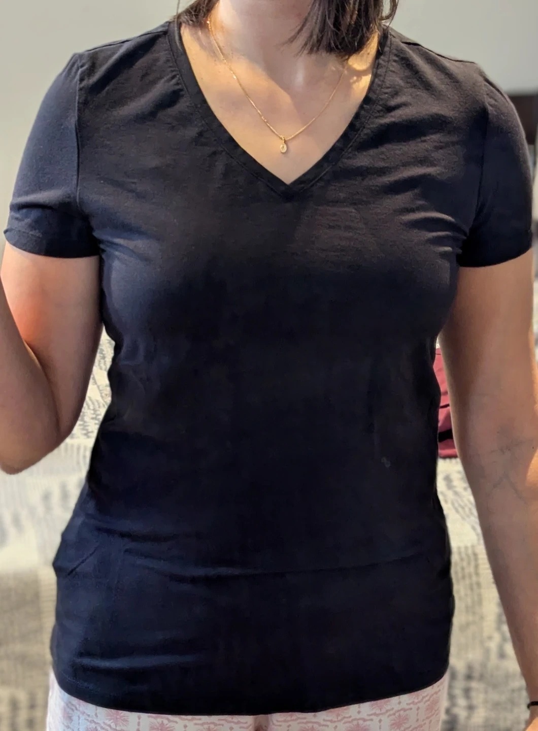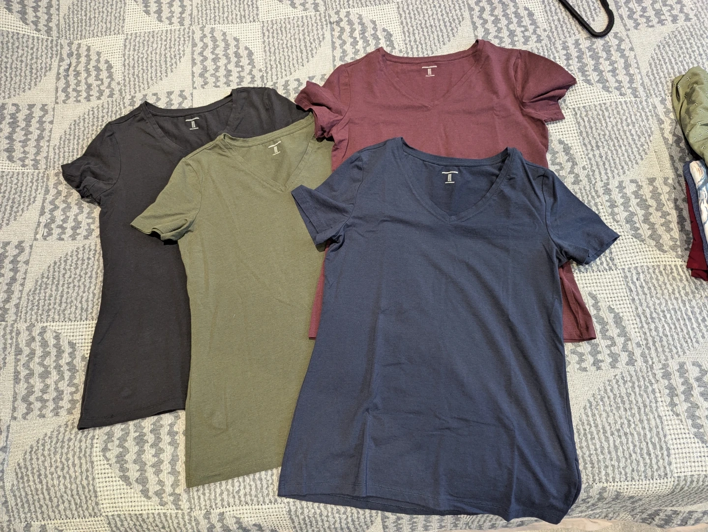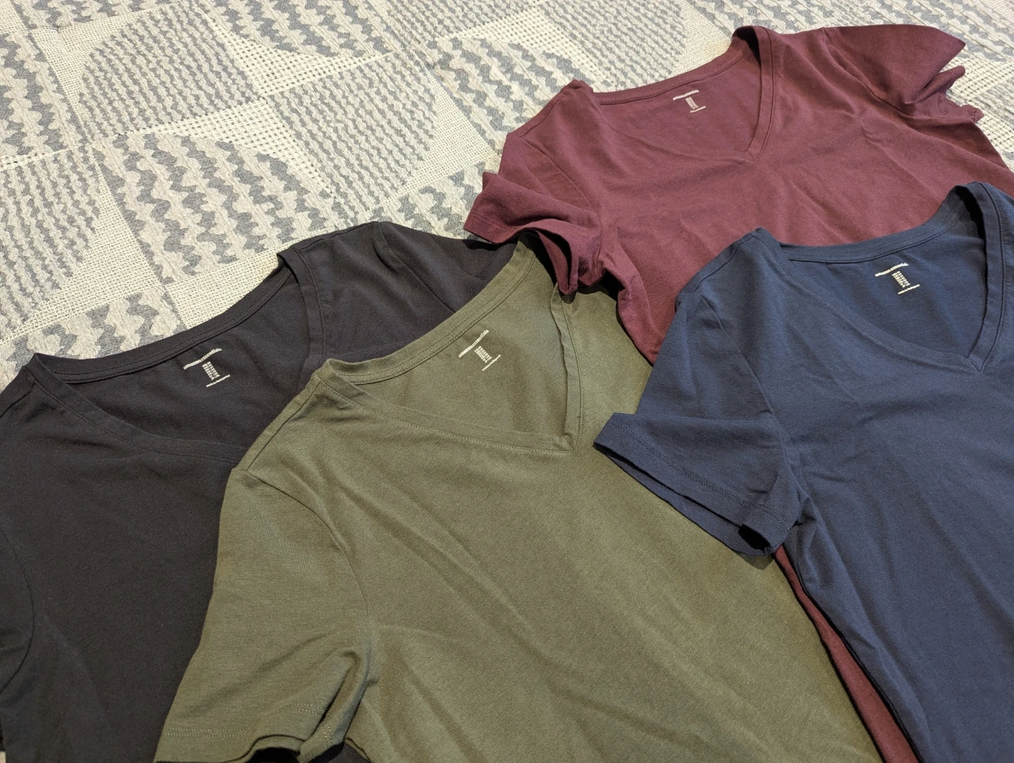 Four V-neck t-shirts in assorted colours: navy, olive, burgundy, and black.