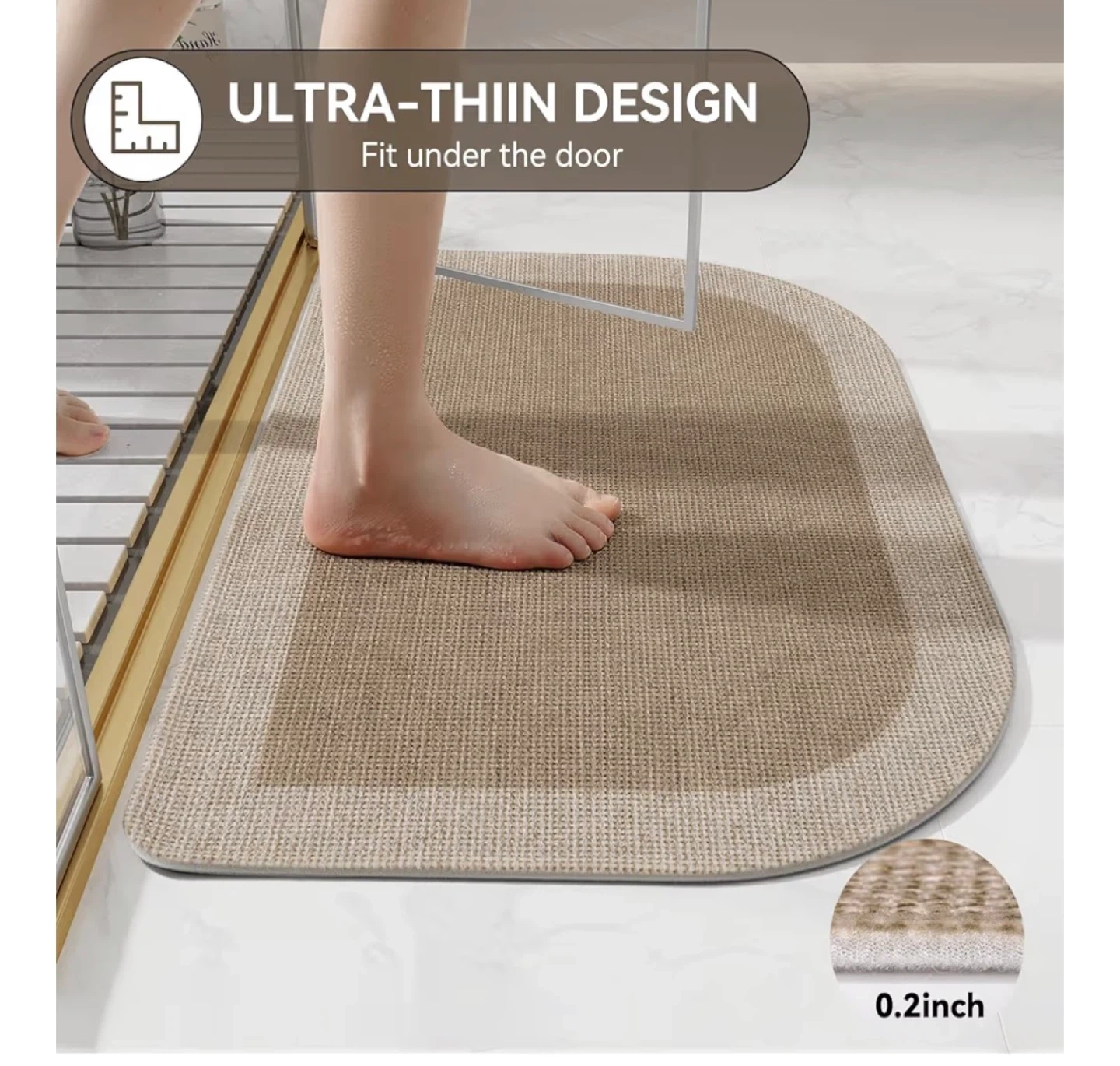 ULTRA THIN BATHROOM RUGS: This braided thin half round bathroom carpet 20x31 fit under door has a thin profile that is easy to pass through doors or wheels and won't obstruct the opening or closing of doors. The thickness is about 0.2 inches. Please check if it fits your needs first. This thin bath mat brown is perfect for bathroom, bathroom showers, bathtub mat, bathroom runner rugs & sink mats.