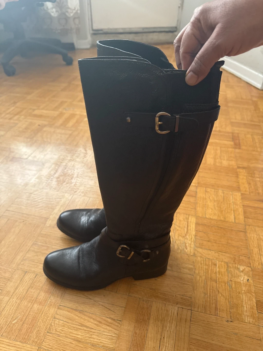 I'm selling a pair of Naturalizer knee-high boots in black leather. They're in great condition and feature a comfortable N5 Comfort design. Perfect for adding a stylish touch to any outfit!