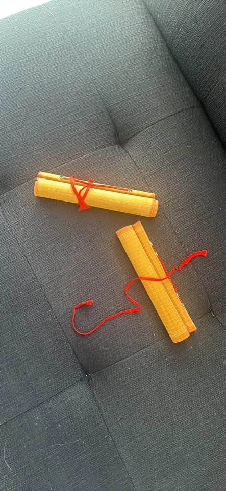 Beautiful set of 2 decorative scrolls with pretty Asian-inspired paintings. One scroll features a woman in traditional clothing, and the other displays a scenic landscape with mountains and a waterfall. Made with a woven material and includes red strings for hanging or tying.