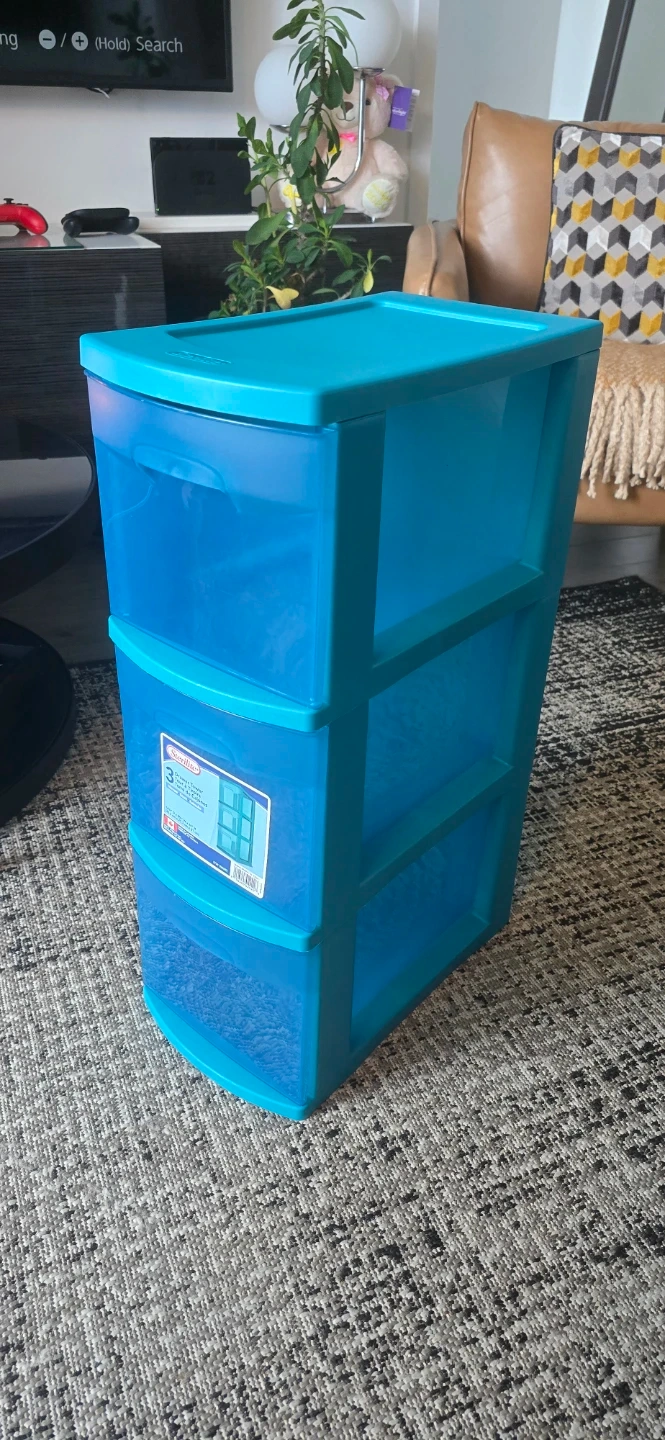 This Sterilite 3 drawer tower is a narrow unit, perfect for organizing small spaces. It's made of plastic and is a bright blue colour. Dimensions are 14.25" D x 8.38" W x 24" H.