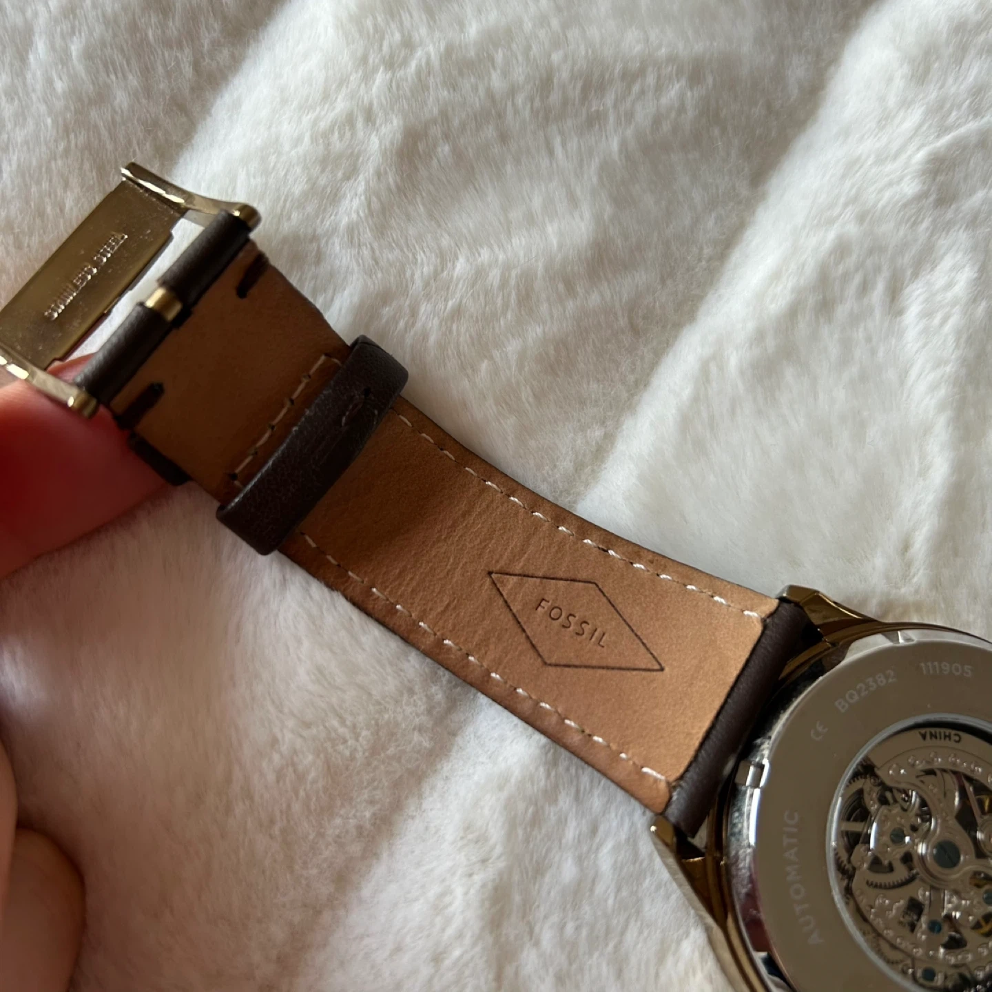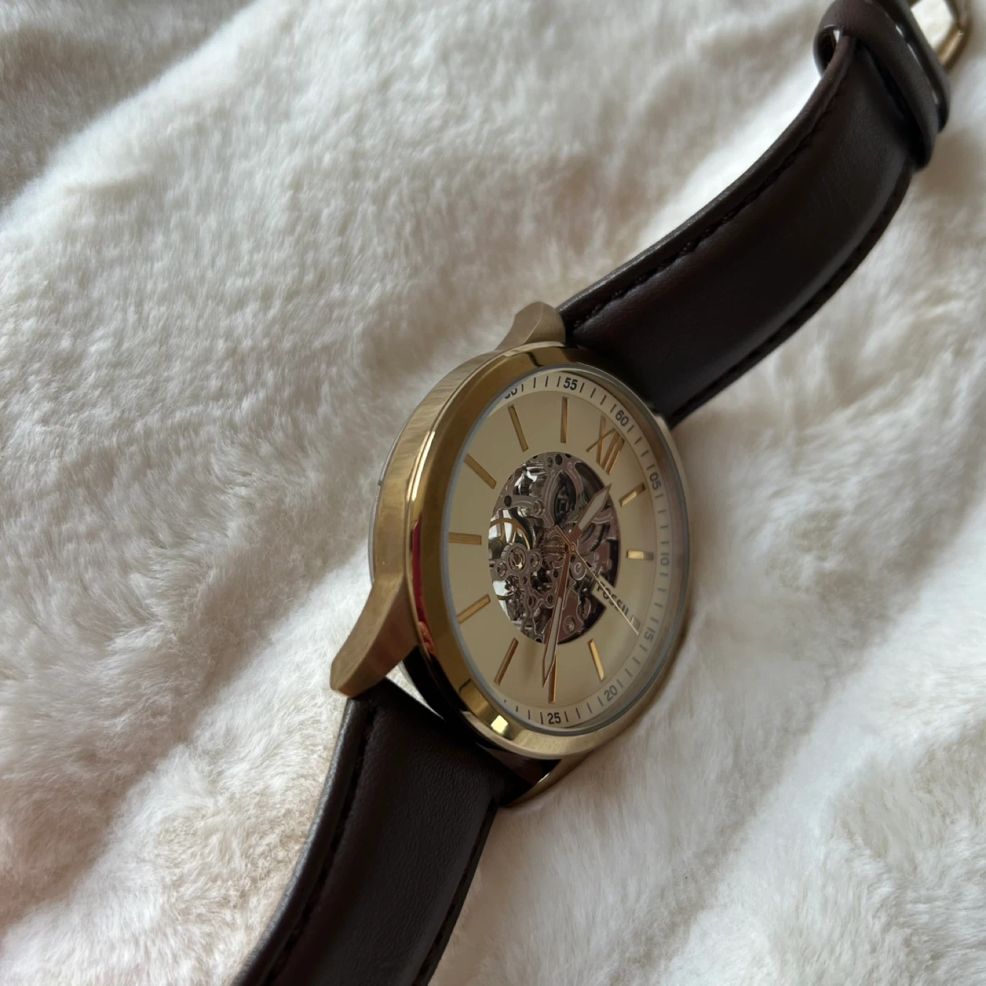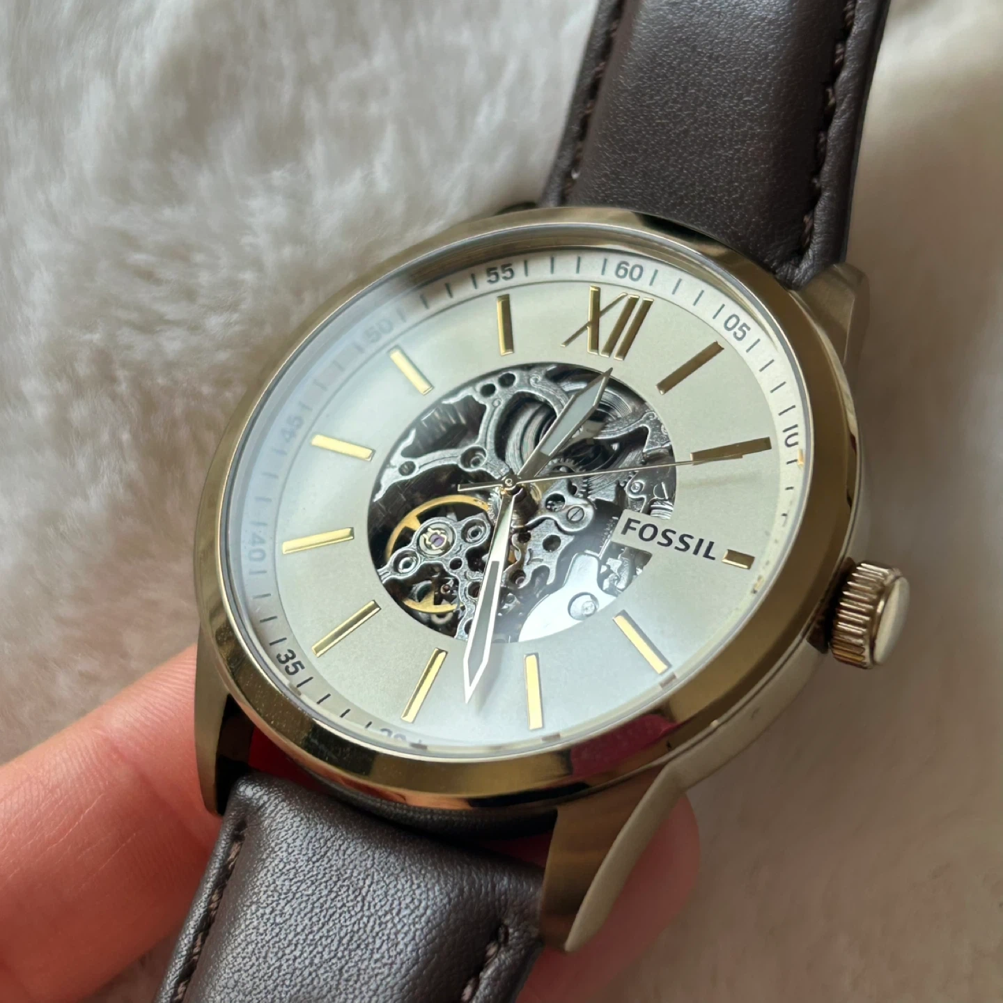 Fossil automatic watch with a skeleton dial. It features a brown leather band and a gold-tone case. This timepiece showcases an open-heart automatic movement.