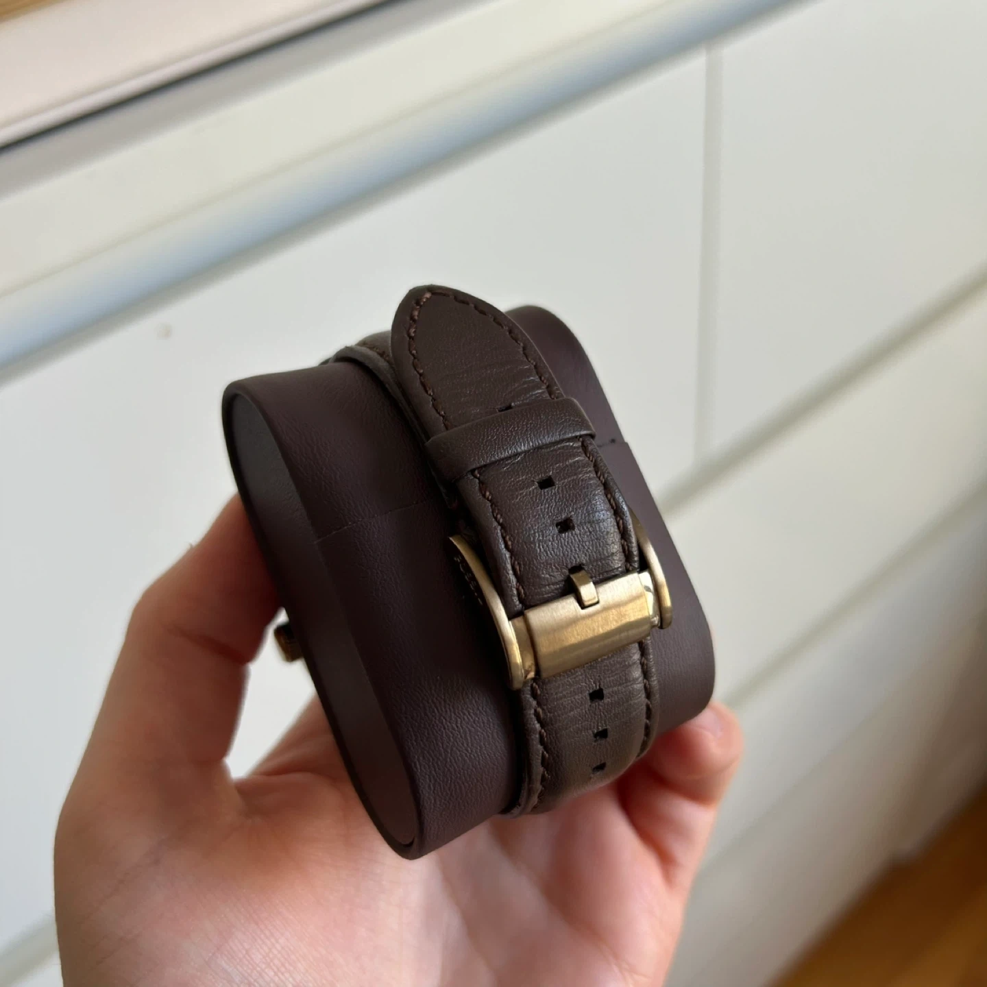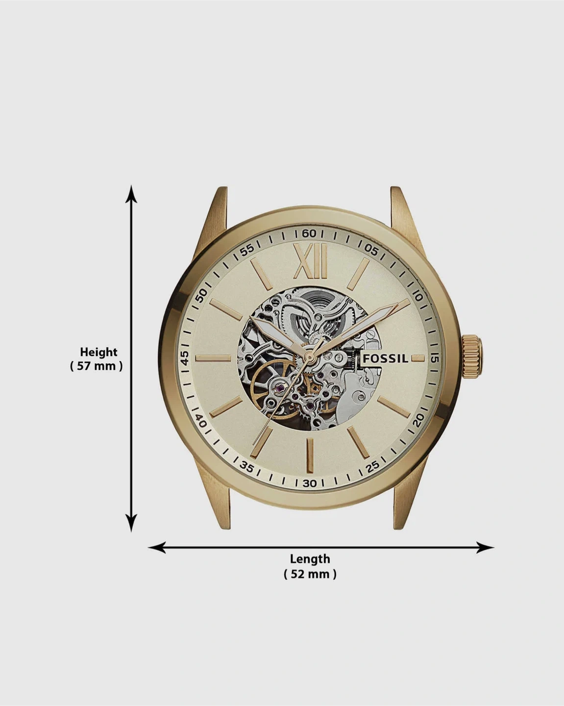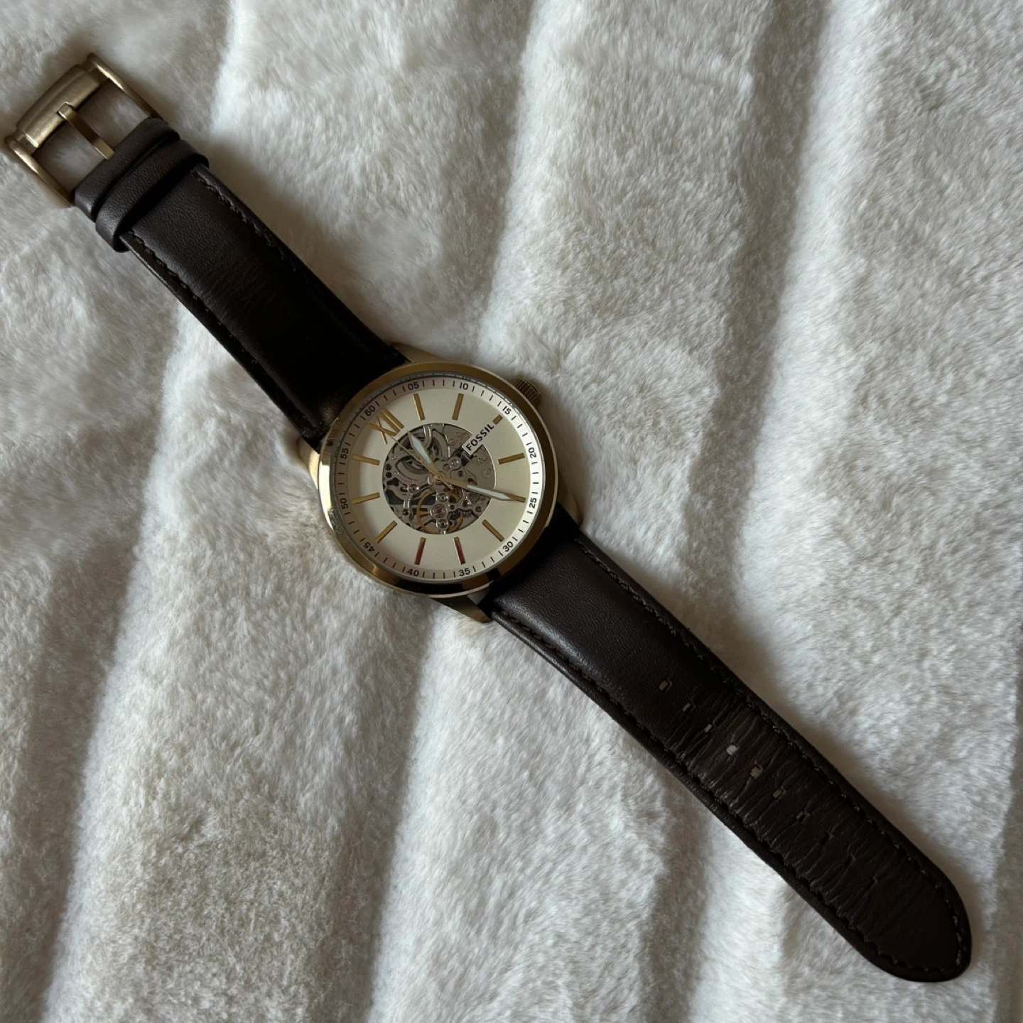 Fossil automatic watch with a skeleton dial. It features a brown leather band and a gold-tone case. This timepiece showcases an open-heart automatic movement.