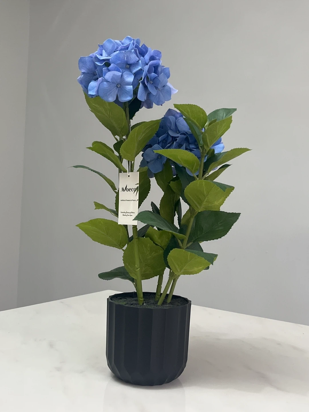 This Aoeco artificial hydrangea plant features vibrant blue flowers and green leaves. It's housed in a stylish black ribbed pot. Adds a touch of greenery without the upkeep!